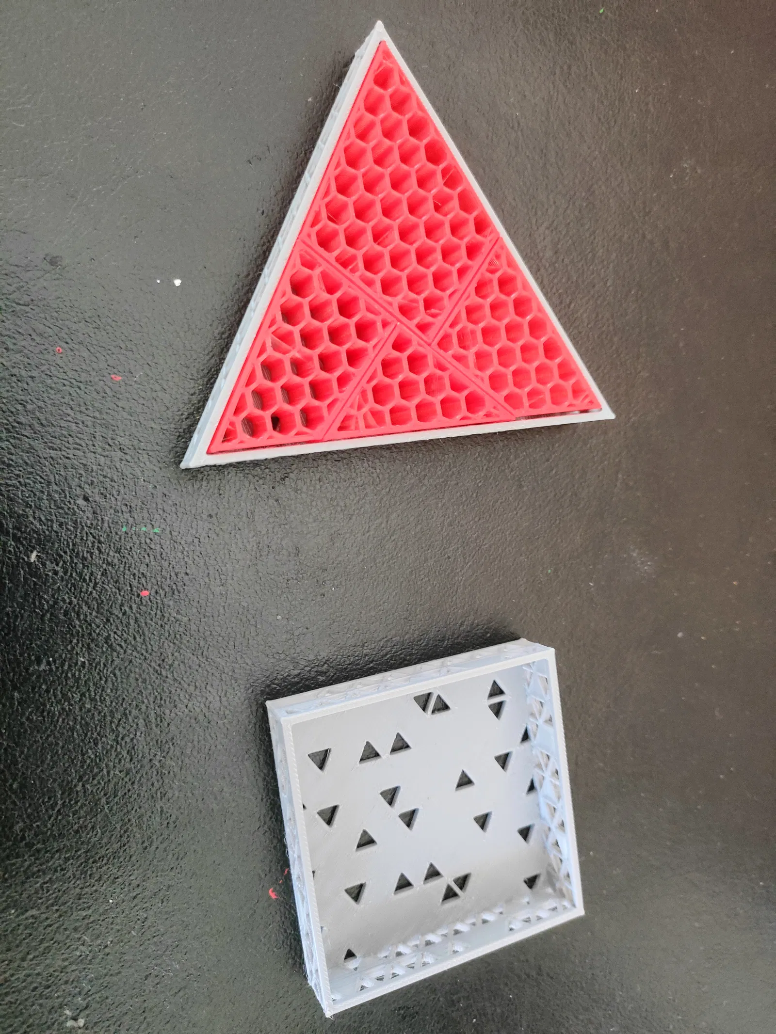 Thoạt nhìn hai hình như khác kích thước, nhưng bạn có thể dùng đúng 4 mảnh giống nhau để xếp được cả hình tam giác lẫn hình vuông. Có kèm hướng dẫn tạo họa tiết honeycomb trong slicer (top/bottom = 0, infill honeycomb).