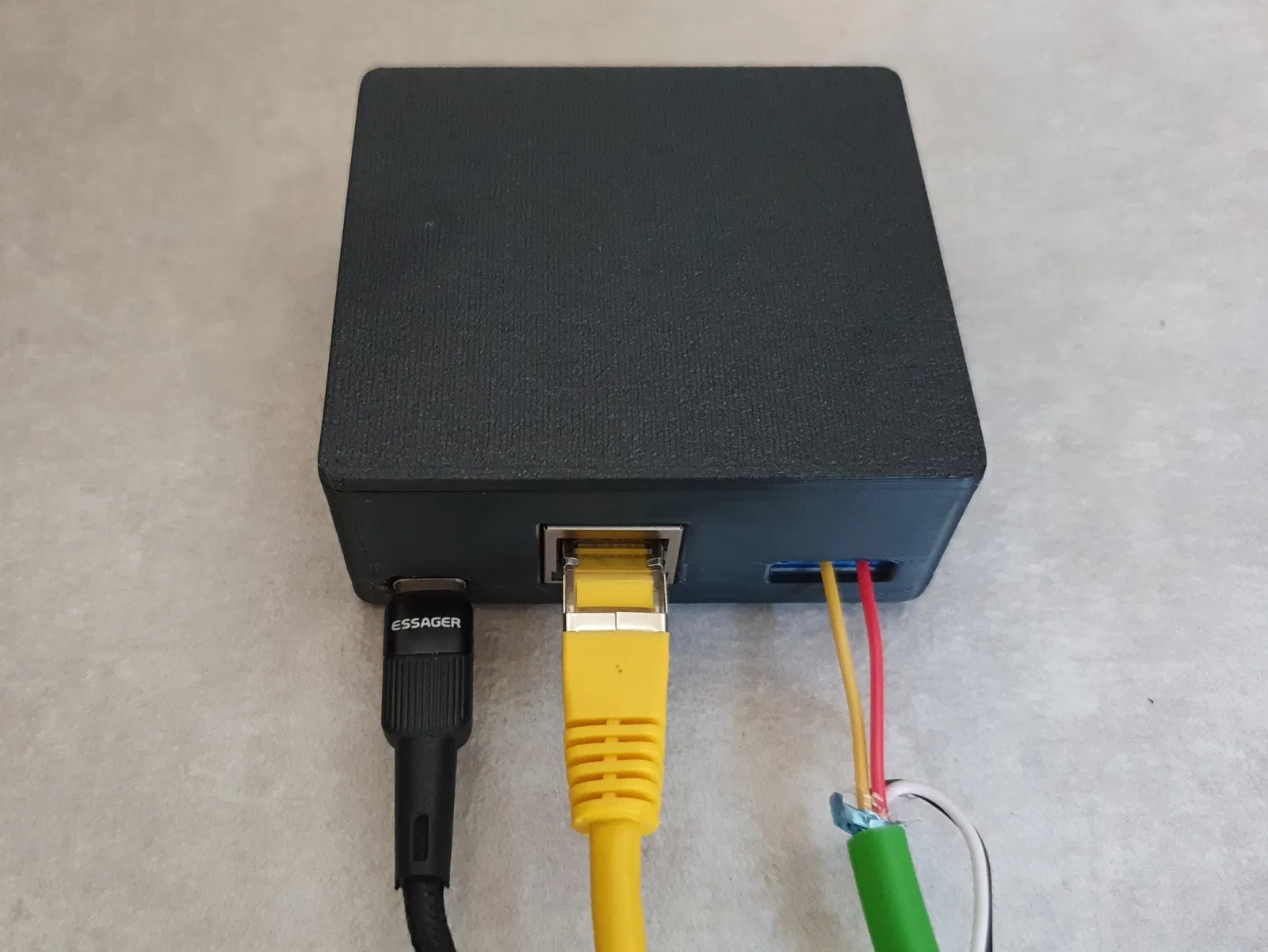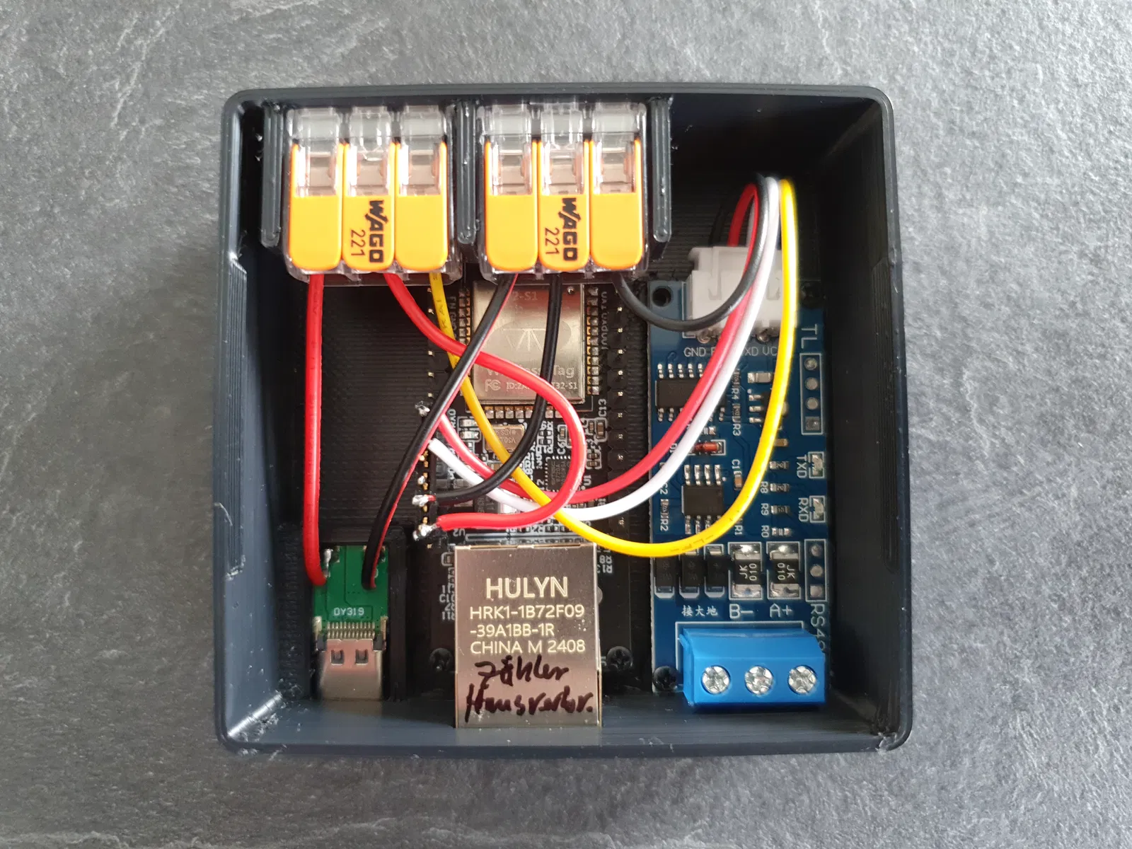 Cắt dây jumper rồi hàn chung với dây nguồn của module RS485 vào bo trigger. Đầu còn lại cắm vào chân nguồn của board ESP. Dán bo USB-C vào trong vỏ.
