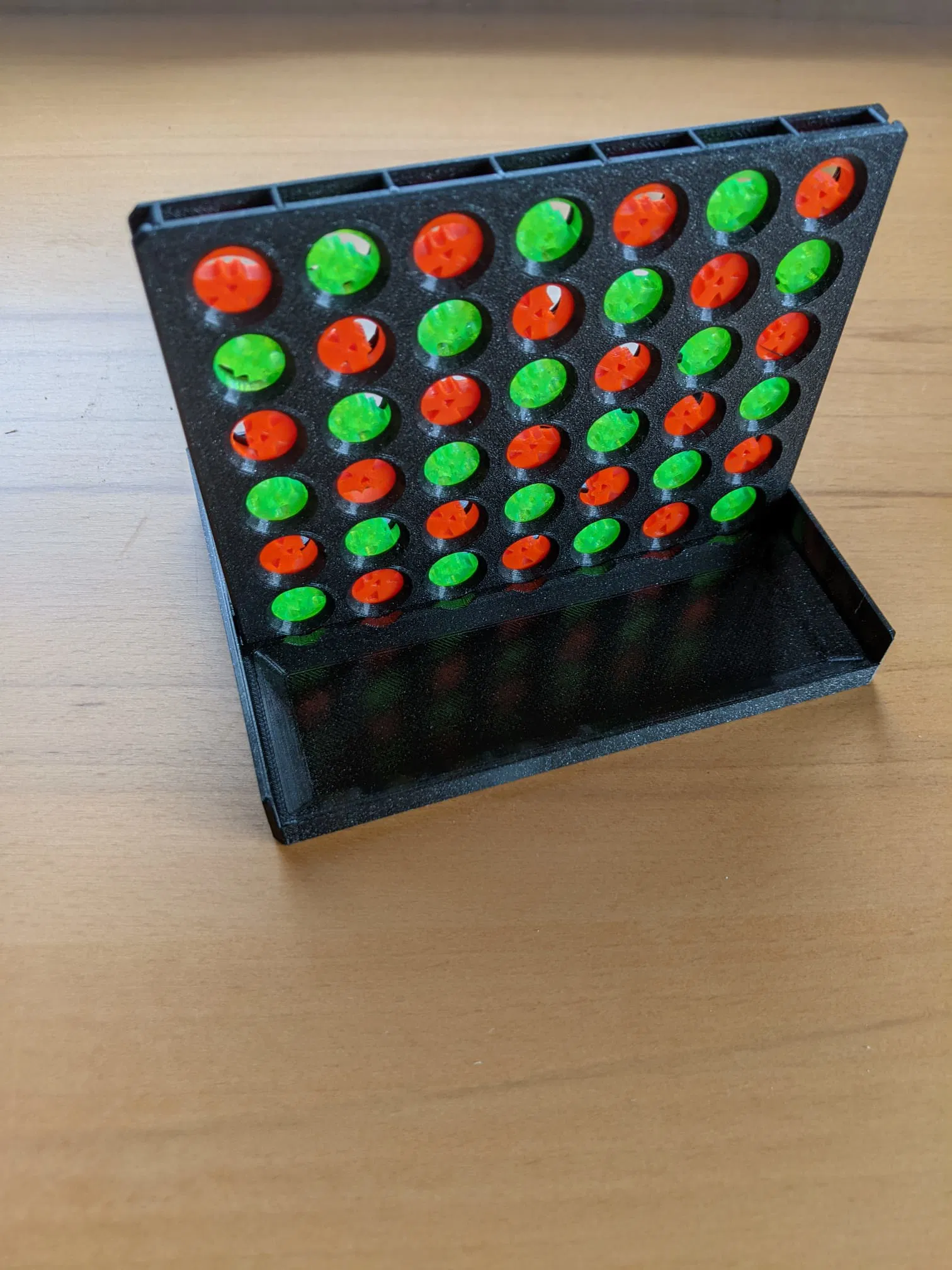 Trò chơi này về cơ bản vẫn giữ nguyên luật chơi quen thuộc của Connect Four: hai người chơi lần lượt thả các quân cờ của mình (màu xanh lá cây và màu cam) vào các lỗ trên bàn cờ thẳng đứng. Mục tiêu là xếp được bốn quân cờ cùng màu thẳng hàng theo chiều ngang, chiều dọc hoặc đường chéo trước đối thủ. Thiết kế của mẫu in này cho phép bàn cờ có thể gập lại gọn gàng sau khi chơi, rất tiện lợi cho việc cất giữ hoặc mang đi.
