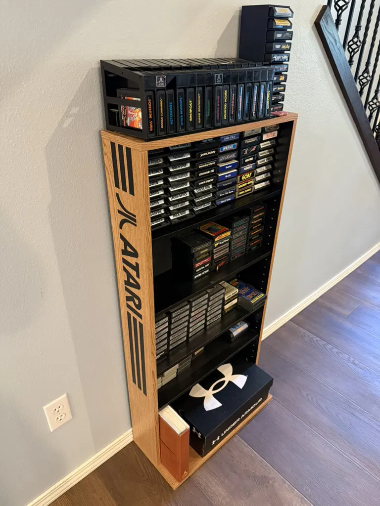 Trong lúc tìm cách sắp xếp gọn gàng mớ game Atari của mình, mình mua một cái kệ/tủ để CD kiểu cũ. Nhưng mình không thích kiểu chỉ chồng băng game lên các tầng, nên mình thiết kế một miếng insert có các khe (slots) để cắm từng cartridge vào. Nhờ vậy bạn không phải lo lỡ tay làm đổ cả một chồng khi rút băng ở dưới cùng.