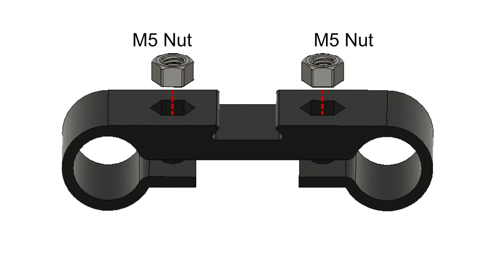 Sau khi in xong 2 chi tiết, đặt đai ốc M5 vào phần lõm, rồi trượt phần trên của ngàm vào (lúc này có thể dán keo nhưng không bắt buộc).