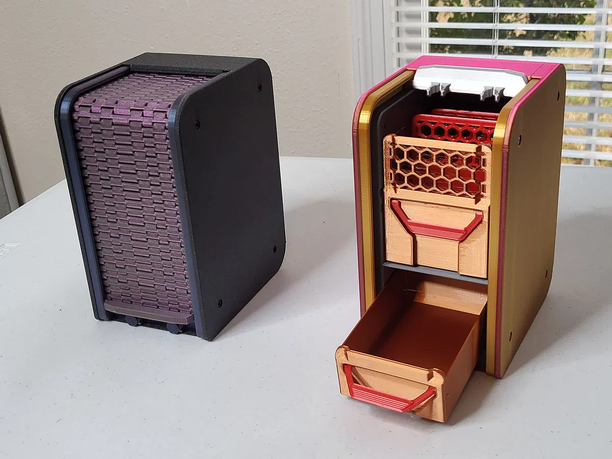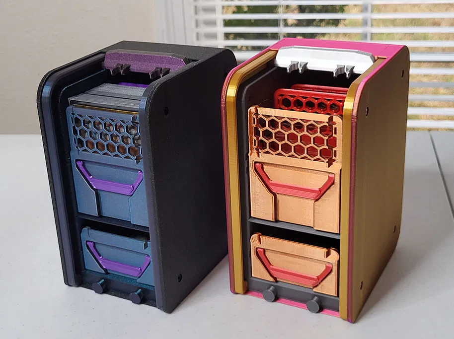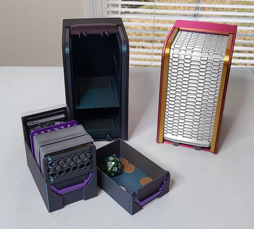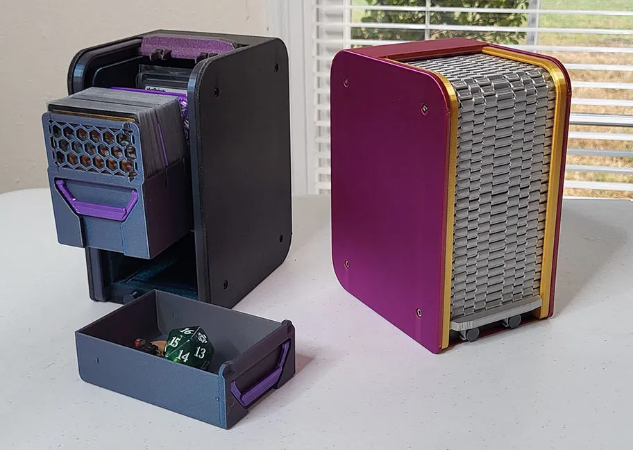 Mẫu hộp lưu trữ collectible card game như MTG, dùng nắp kiểu tambour trượt theo ray. Có Tracks dạng print-in-place, lắp ráp bằng ốc M3. Lưu ý cần print bed đủ lớn để in Tambour Tracks và canh khớp chính xác.