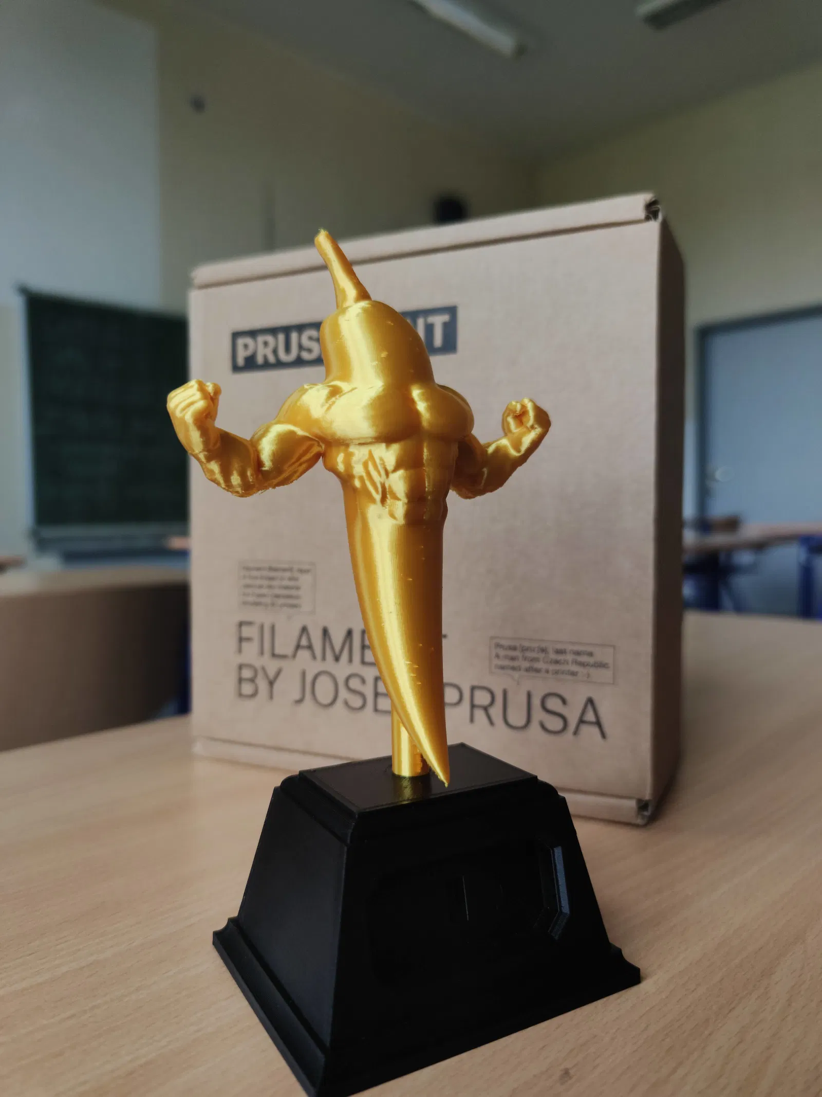 Mình in phần tượng chili champ bằng Prusament PLA Oh my gold vì còn dư một ít, mà đây cũng là một trong những loại filament màu vàng đẹp nhất. Hướng đặt lý tưởng để in là để tượng đứng trên cái trụ tròn nhỏ ở phía dưới đáy. Mình chỉ thêm support trên build plate cho phần chóp quả ớt và hai cánh tay. Phần đế mình in bằng Verbatim PLA màu đen. Nếu máy in của bạn đã calibrate chuẩn thì không cần dùng support cho phần này. Mình in cái bảng chữ bằng Prusament màu vàng, rồi dùng chức năng đổi màu (color change) trong PrusaSlicer và in phần còn lại của bảng chữ bằng PLA đen để độ tương phản cao hơn.