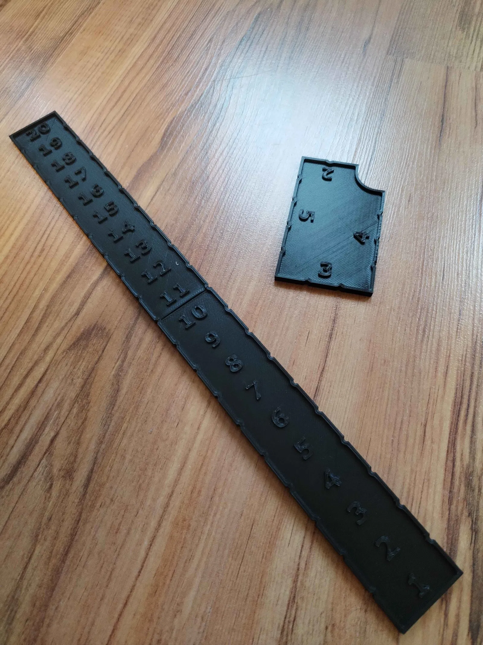 Thước đo tầm (range ruler) cho Warcrow tabletop của Corvus Belli, thiết kế theo chuẩn 15 mm = 1 stride để khớp vạch đo trong game. Gợi ý in: support chỉ trên build plate, layer 0.2 mm, PLA, nozzle 0.4 mm, infill 15%.