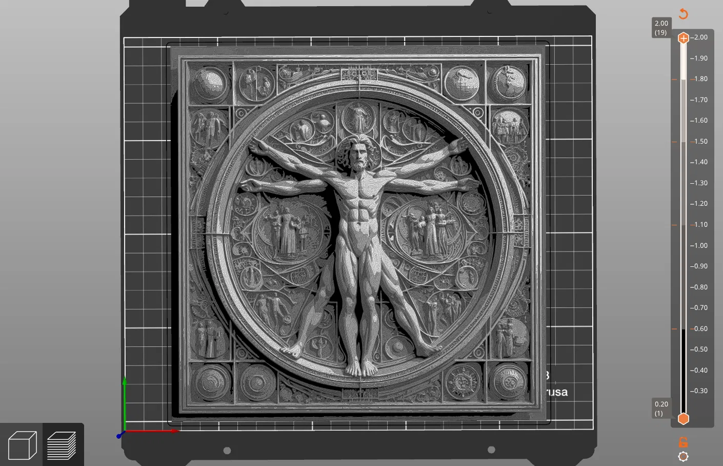 Mẫu in 3D tái hiện Vitruvian Man của Leonardo da Vinci dưới dạng tấm nổi, dùng chuyển sắc theo lớp từ 0.0–2.0mm để tạo chiều sâu và tương phản, kết hợp mỹ thuật cổ điển với công nghệ 3D hiện đại.