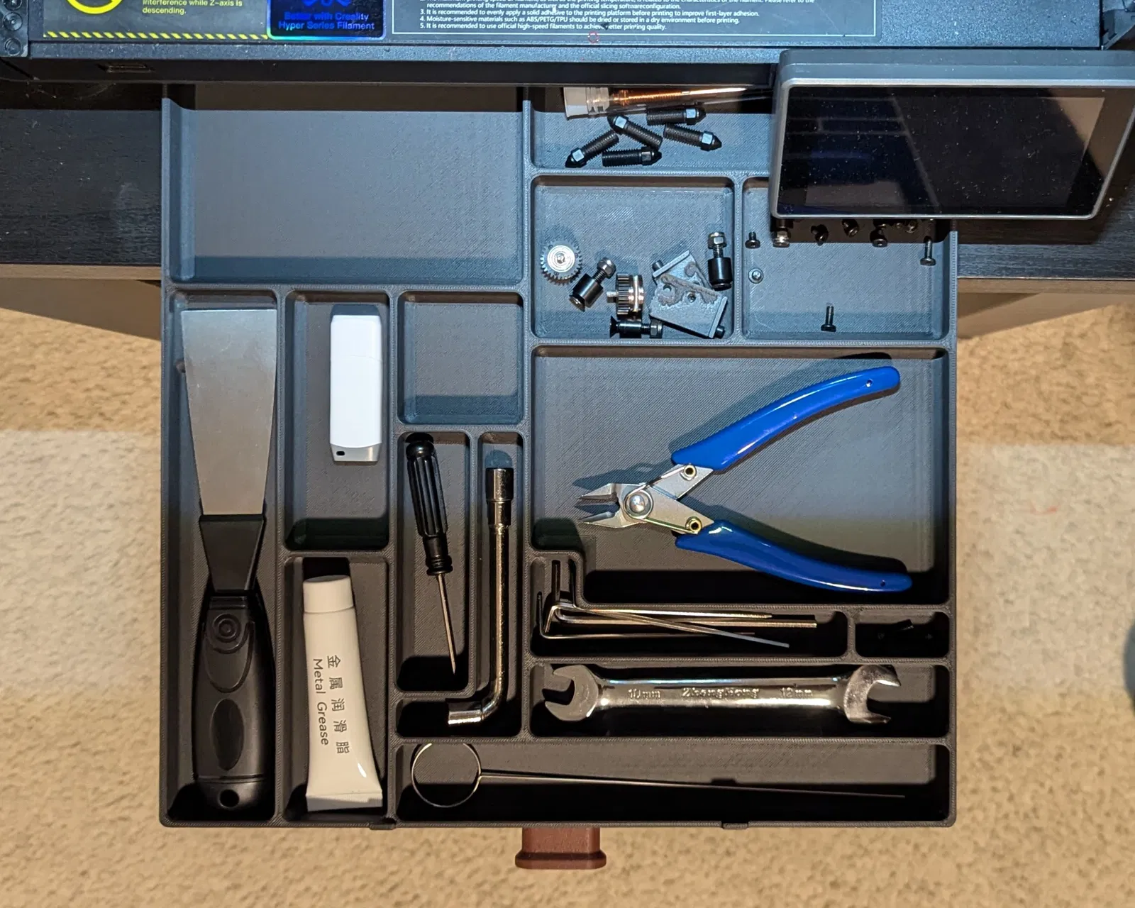 Ngăn kéo lưu trữ đặt dưới Creality K1 Max, kích thước 300×300×19mm, có nhiều ngăn để dụng cụ, ốc vít, nozzle. Lưu ý glue stick không vừa; cán spatula có thể hơi cạ, chà nhám là ổn.