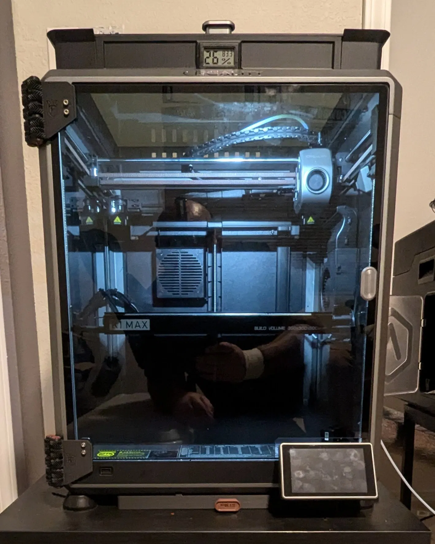 Ngăn kéo này kích thước 300mm x 300mm x 19mm, thiết kế để chứa đa số các dụng cụ đi kèm K1 Max, đồng thời có nhiều ngăn để đựng ốc vít, nozzle và linh tinh khác.