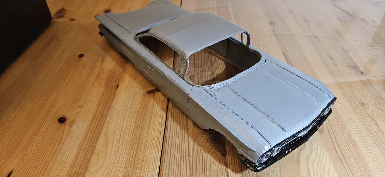 Project thân xe Impala 1960 tỉ lệ 1:12 dạng .3mf, nhiều chi tiết floating và negative parts làm bằng Bambu Studio, in trên P1S. Đèn hậu cắt từ bút; mẫu được xịt clear gloss nên bóng và màu đậm hơn.