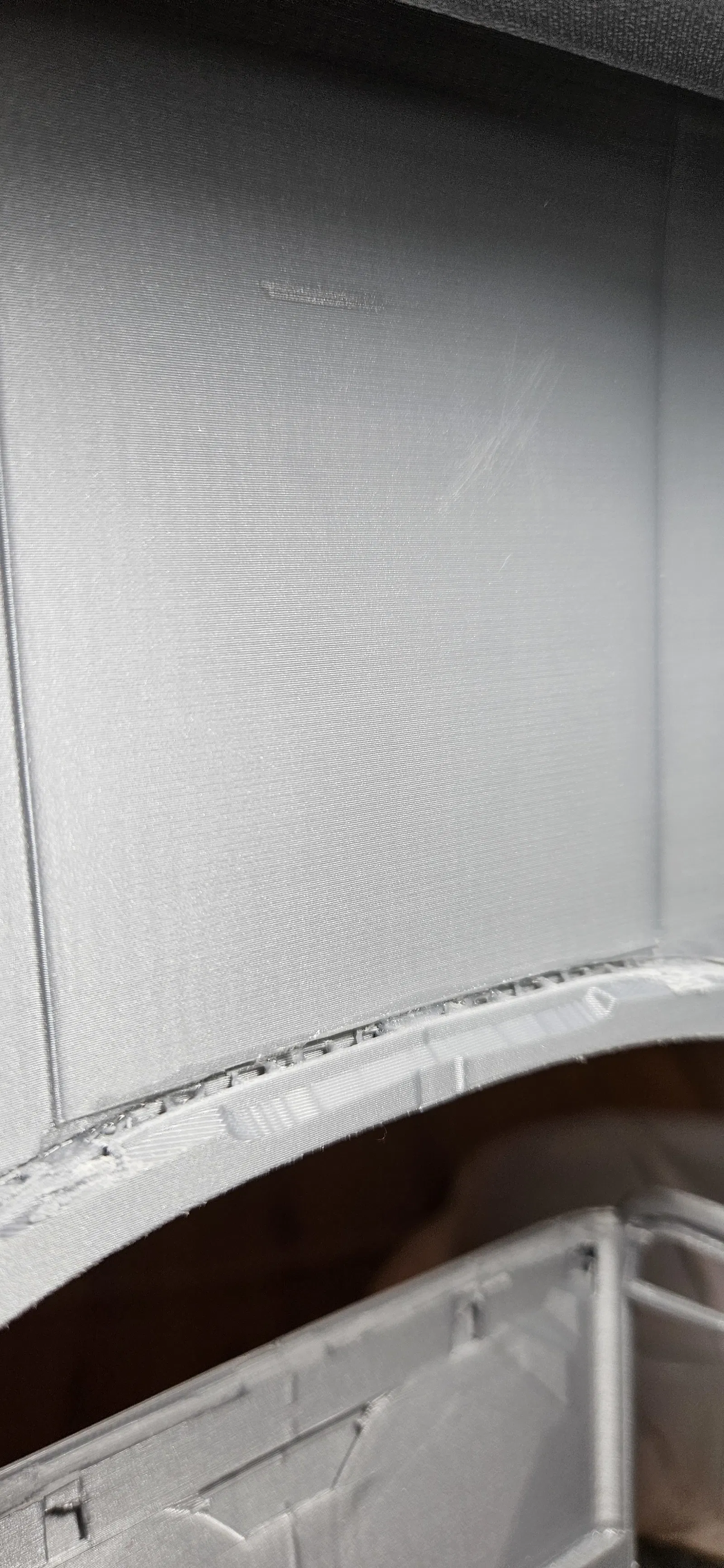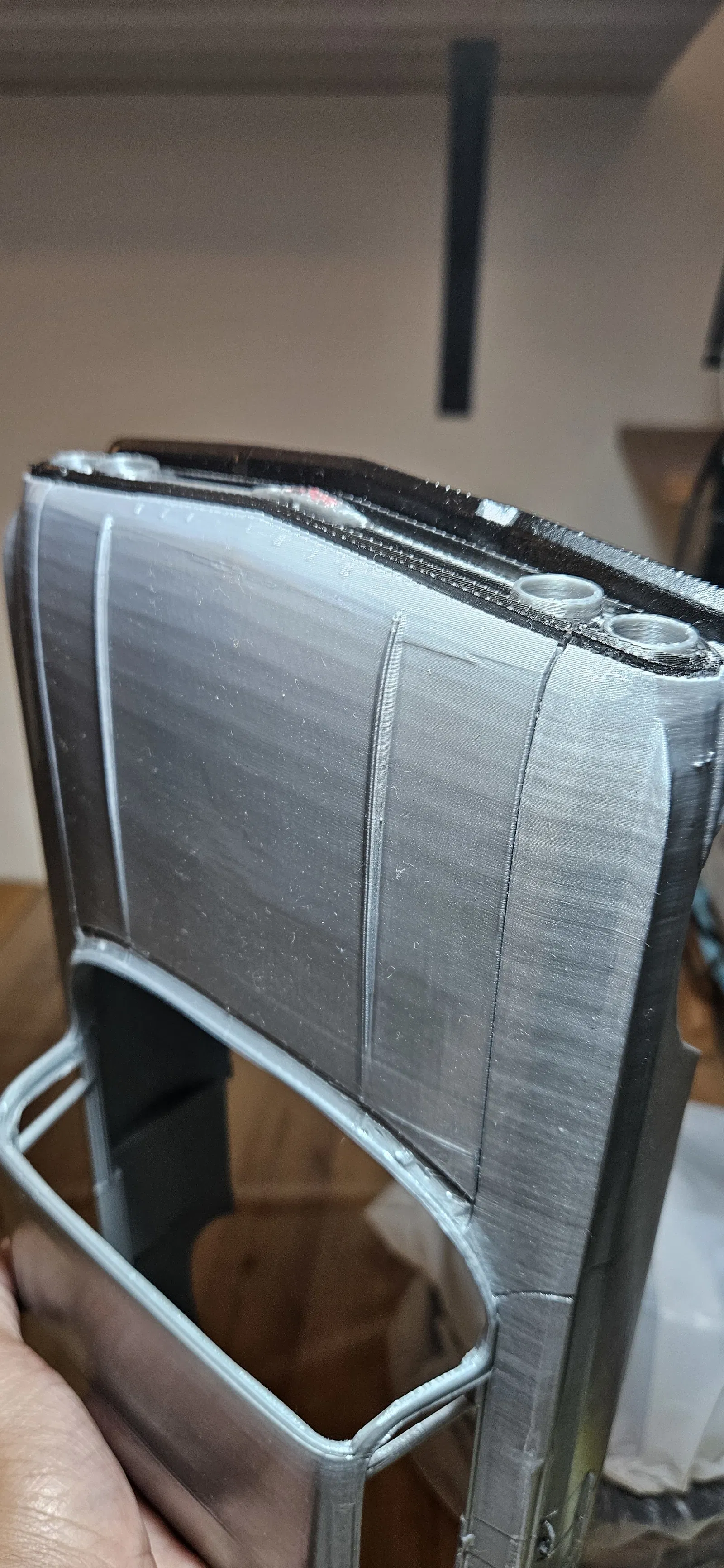 Có thể file model gốc lúc export lần đầu không được export ở độ phân giải mịn. Mình nói vậy vì… mình đã in cái project 20 tiếng này 3 lần, và làm nhiều test trên mẫu với tốc độ outer walls chậm hơn, nhiệt độ cao hơn ở nhiều mức flow rate khác nhau (0.93–1.03), rồi căn chỉnh lại dây đai XY và Z, nhưng vẫn ra đúng y chang cái pattern này ở mặt ngoài của vỏ. Trong khi mặt trong thì rất sạch và mượt. Có thể do mặt trong được slicer cắt “gọn” nhờ các negative parts, còn bề mặt ngoài là bề mặt gốc. Nhưng như mình nói, phần nóc, cốp (trunk) và capo đã được remodel gần như toàn bộ… mà vẫn bị đúng cái pattern đó chỉ ở bên ngoài… bên trong thì sạch và mượt… và có 2 mẫu mình in ở tốc độ outer wall 100 mm/s thì nhìn y chang mẫu đầu tiên vốn in outer walls ở tốc độ gốc 200 mm/s.