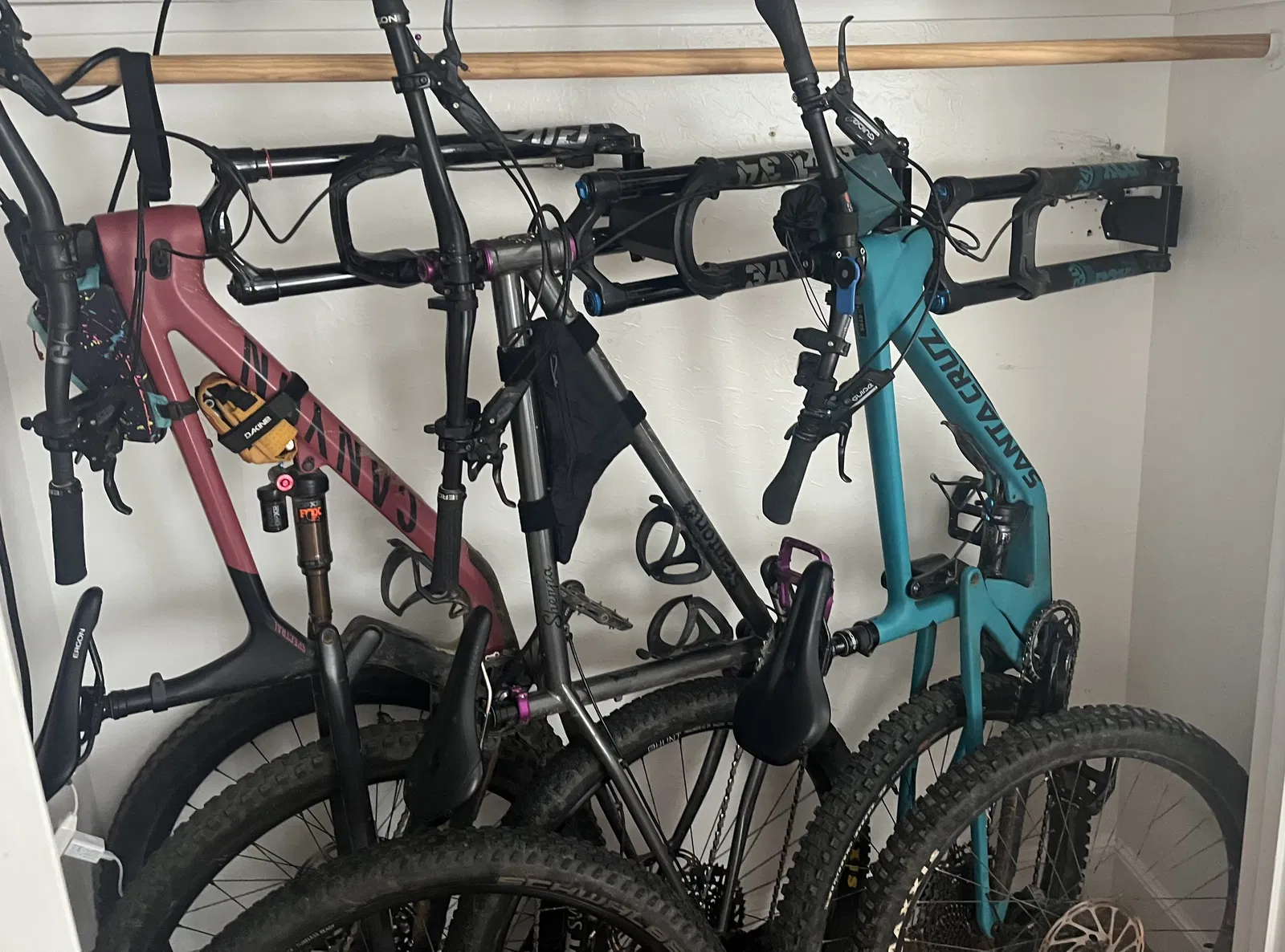 Nhiều năm nay mình dùng dây velcro luồn giữa headtube và fork rồi quấn lên một thanh treo đồ bằng gỗ. Cách velcro này rất khó canh thăng bằng xe trong lúc luồn dây và siết lại. Nói chung phải cần tới 3 tay.