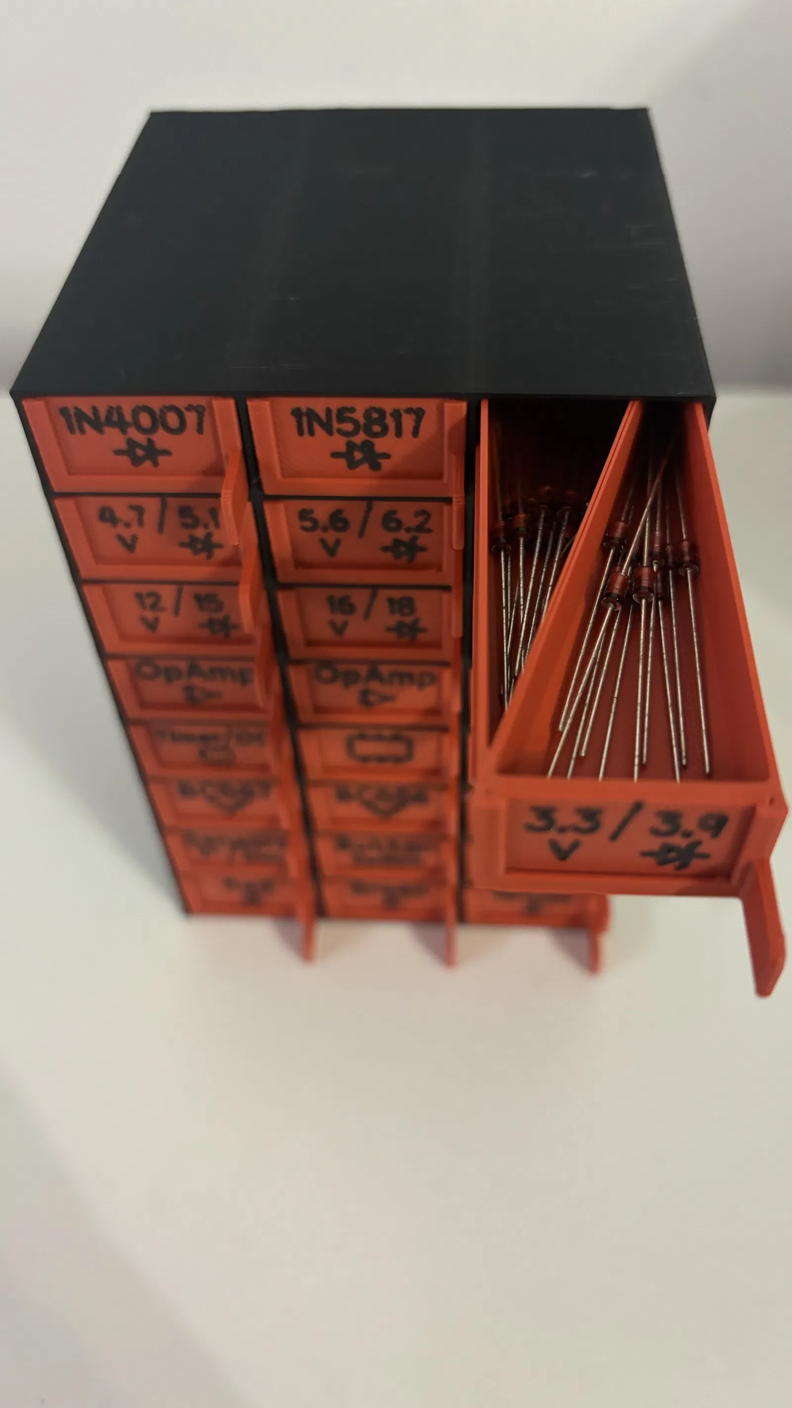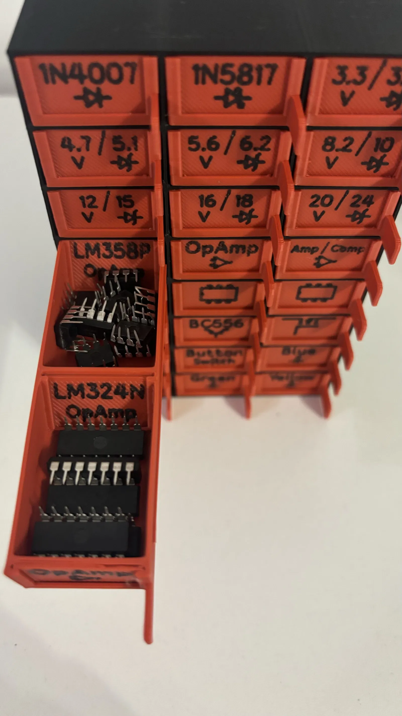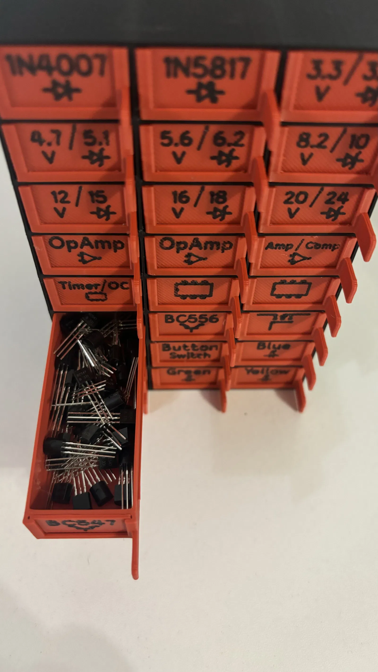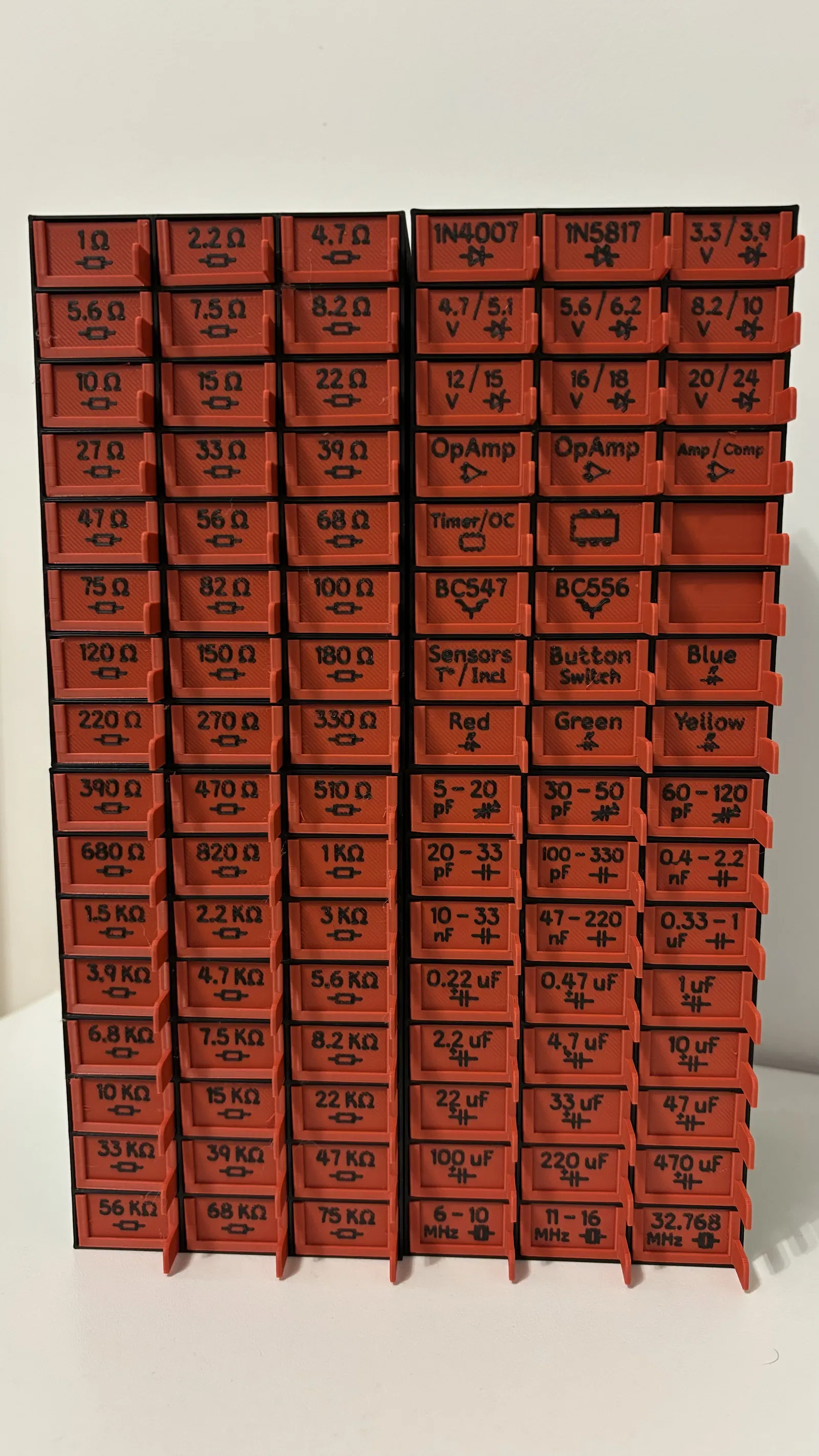 Hộp đựng linh kiện điện tử thiết kế tối giản, có các ngăn kéo để sắp xếp điện trở, tụ điện, diode, LED, IC… Phù hợp in 3D bằng PLA, dễ dán nhãn phân loại và cất gọn trên bàn làm việc.