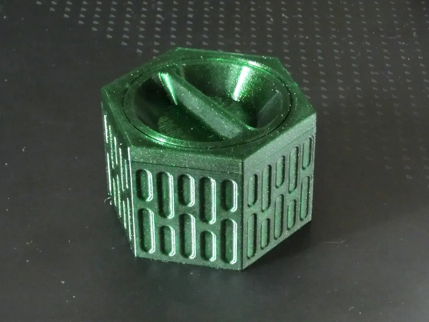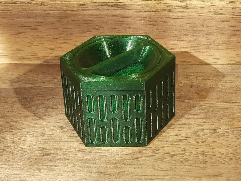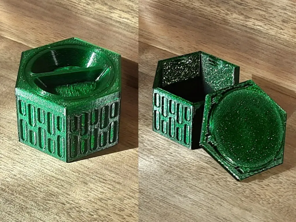 Tôi đã làm một cái hộp nhỏ xinh với cơ chế nắp vít in tại chỗ. Cơ chế đóng nắp được lấy cảm hứng mạnh mẽ từ ; tôi cũng đã làm một phiên bản hình vuông, nhưng nó quá giống với mô hình của anh ấy, vì vậy tôi không công bố nó. Tôi cũng có một phiên bản ngũ giác mà tôi có thể chia sẻ nếu có sự quan tâm (chỉ cần hỏi trong phần bình luận). Phải có đủ độ dung sai cho hầu hết các máy in, nhưng nếu vít không xoay ngay cả khi có một lực xoay thuyết phục (mà nó cần lần đầu tiên), bạn có thể in lại nắp với một bù kích thước xy hơi âm. Tôi đã sử dụng PLA (Prusament Galaxy Green), chiều cao lớp 0.2mm, đầu phun 0.4mm, cài đặt tiêu chuẩn. Một chút bôi trơn (mỡ, dầu) giúp cho hoạt động mượt mà hơn. Bạn cũng có thể tách mô hình thành các đối tượng, ghép lại hai phần nắp, thay đổi chiều cao lớp của nắp đó thành, ví dụ, 0.17mm và sử dụng 'các đối tượng riêng lẻ hoàn chỉnh' (hoặc chỉ in chúng riêng biệt), điều đó cũng giúp cho hoạt động mượt mà hơn.