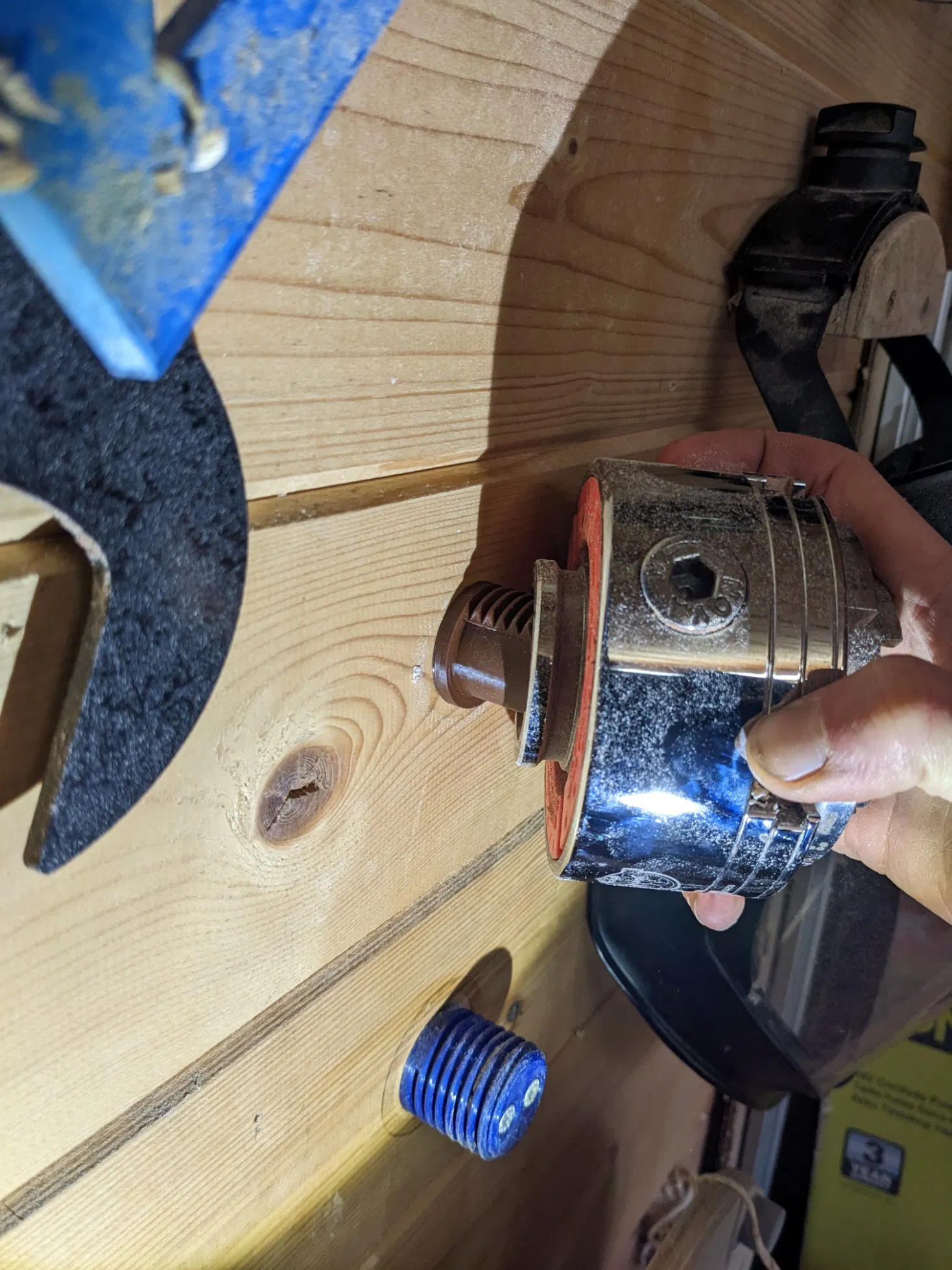 Chỉ cần đẩy chuck vô holder tới sát hết cỡ phía sau là nó sẽ nằm chắc trên phần ren và không bị lắc hay tuột ra. Mình biết cái này cũng có thể làm đơn giản bằng một cây dowel gắn trên tấm ván theo góc nghiêng, nhưng mình thích kiểu này hơn vì nó giữ chuck rất chắc, không bị lỏng lẻo hay rung lắc.