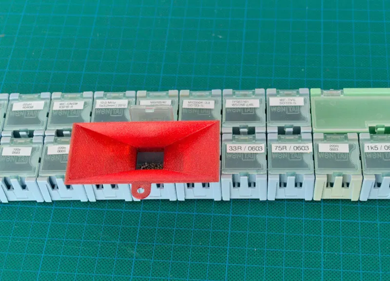 Đối với các mẫu thử nghiệm và sửa chữa, tôi sử dụng các thùng nhỏ cho linh kiện SMD. Khi một thùng trống, tôi đổ đầy nó từ một cuộn (hoặc một đoạn "băng cắt"). Để làm điều đó, một cái phễu thực sự rất tiện lợi.