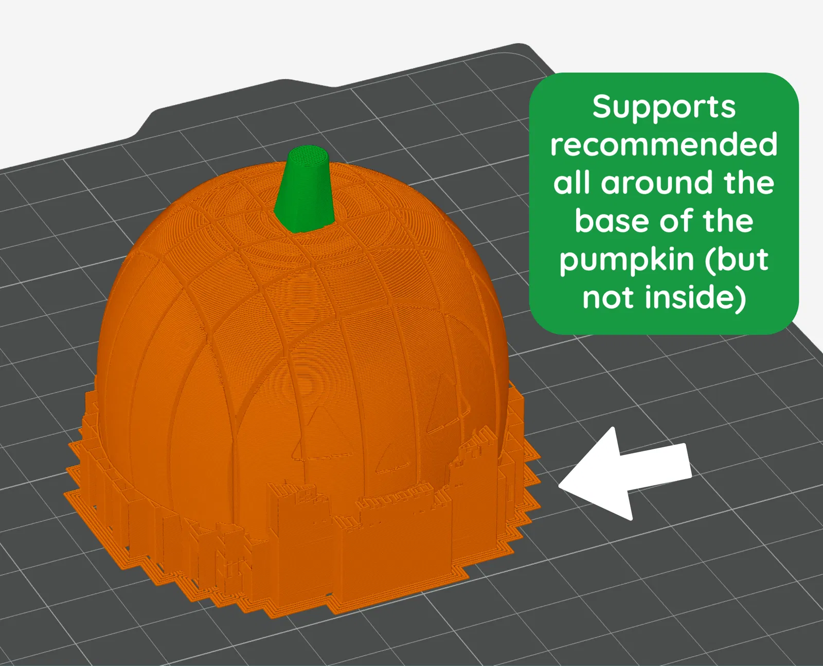 ** Mình rất khuyến nghị dùng supports bao quanh toàn bộ phần đáy của quả bí (xem hình). Mình đã in nhiều cái chỉ dùng brim, nhưng khoảng một nửa số lần sẽ có một “pixel” (hay một cột) bị xê dịch giữa chừng, nên để chắc ăn mình khuyên dùng một “vòng cổ” support chạy quanh quả bí và thêm support ở phần “miệng” của khuôn mặt. Mình đã thiết lập sẵn trong các profile in 3mf như sau: