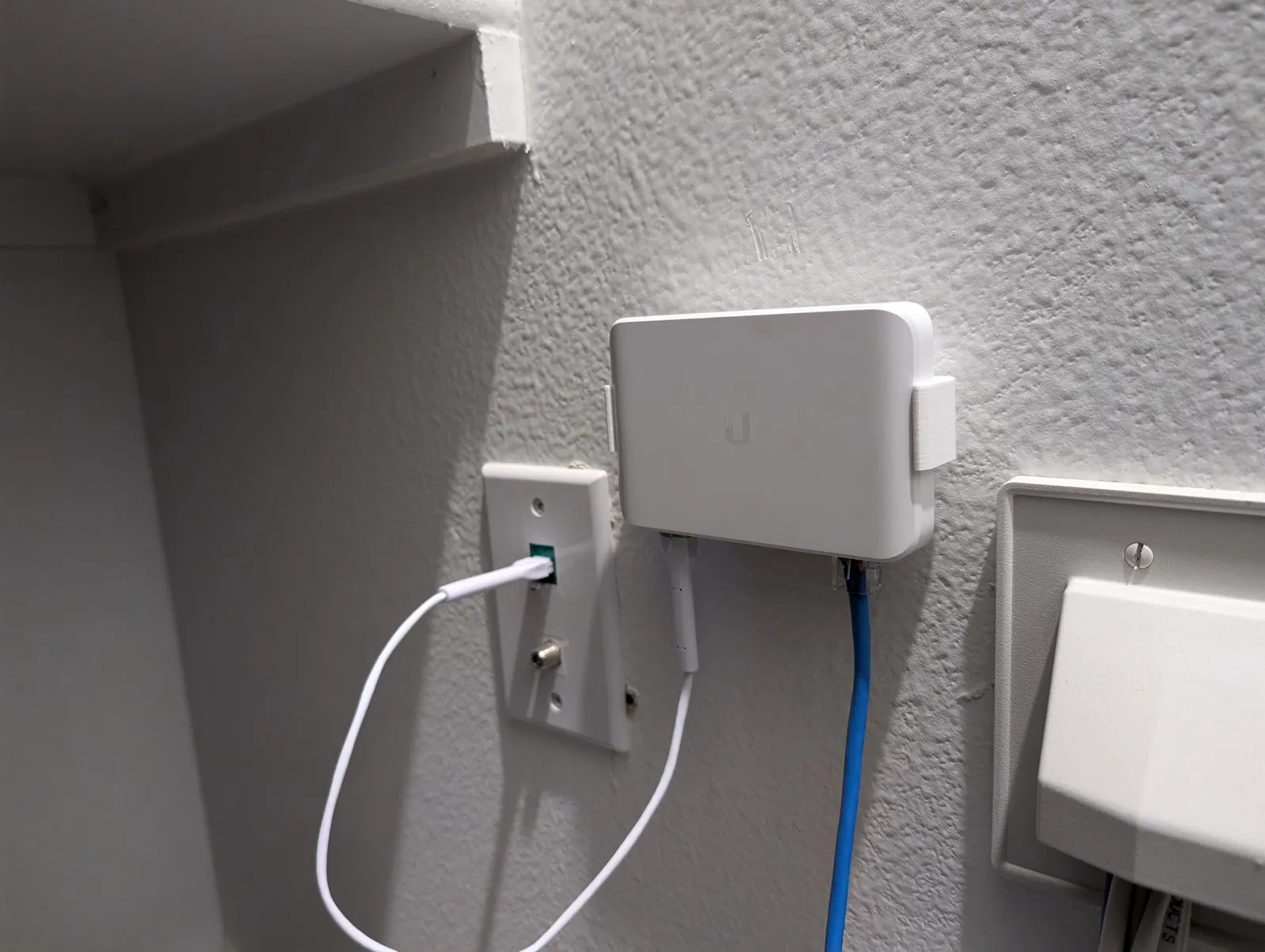 Một bộ gá treo tường tối giản theo kiểu friction fit, thiết kế ôm khít chiếc switch Ubiquiti Flex Mini. Lớp đệm cao su phía sau của switch giúp tạo độ bám rất tốt cho kiểu lắp friction fit.