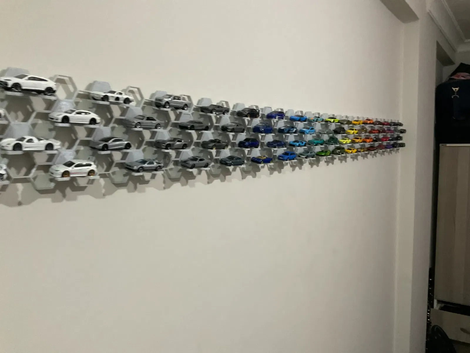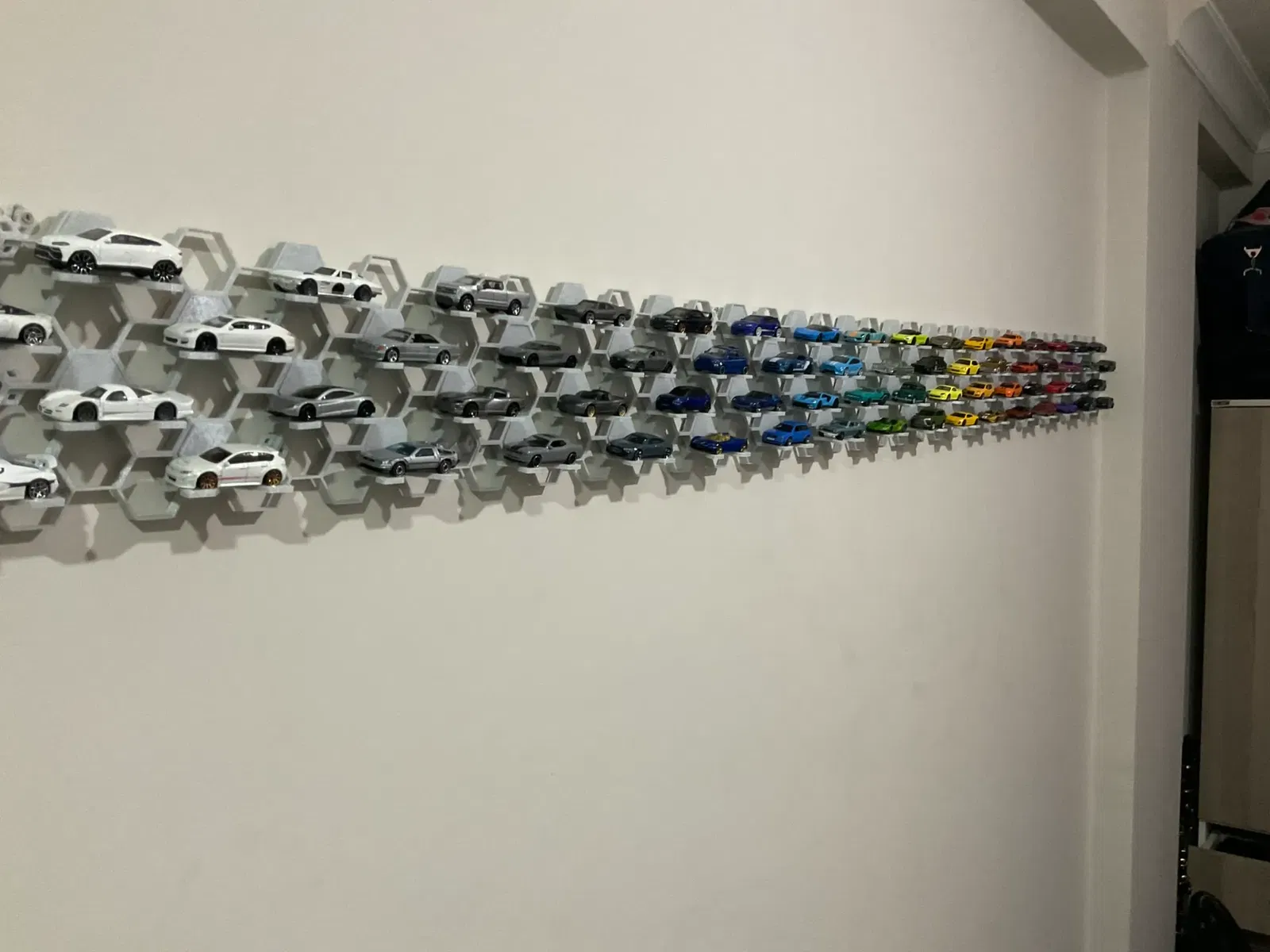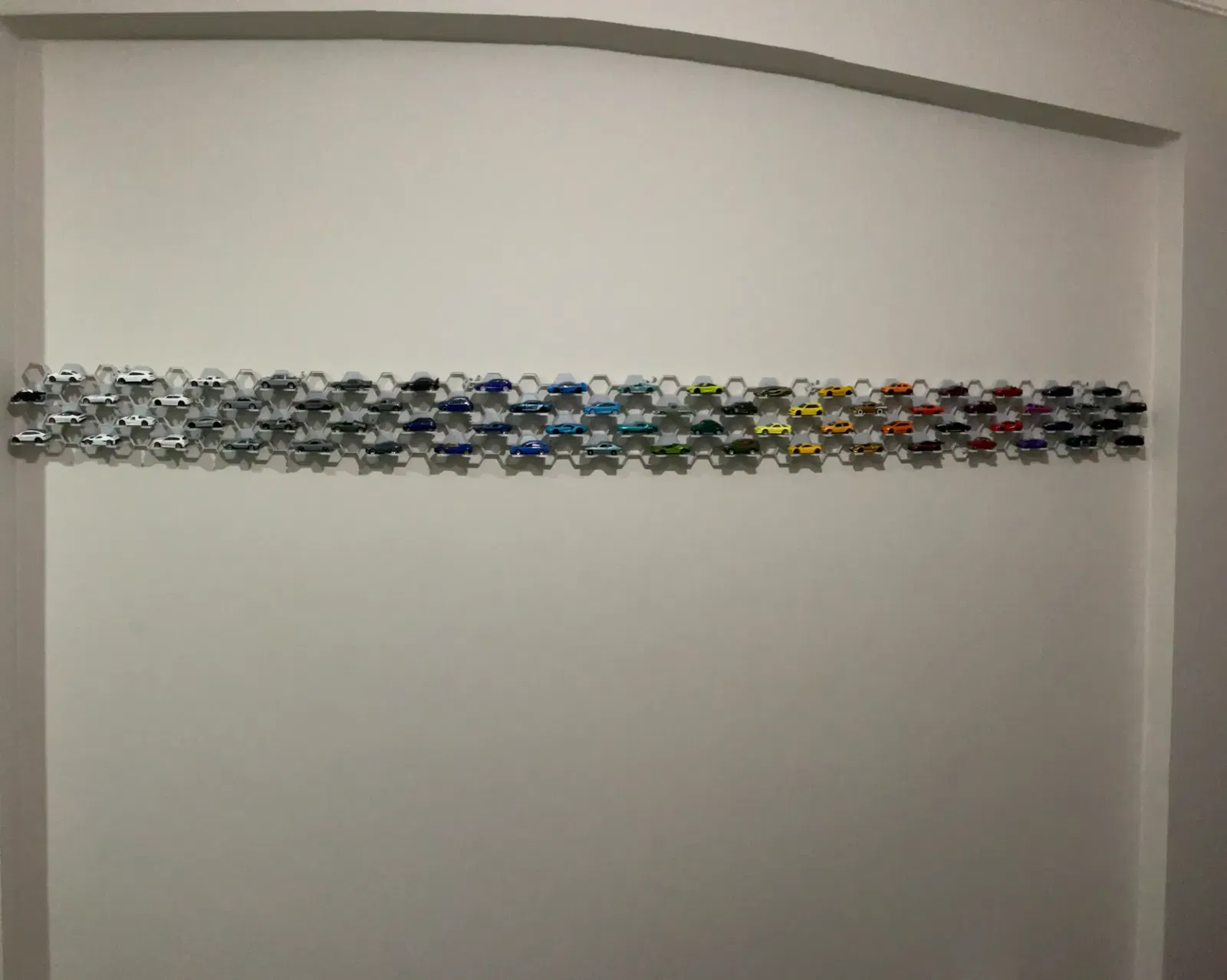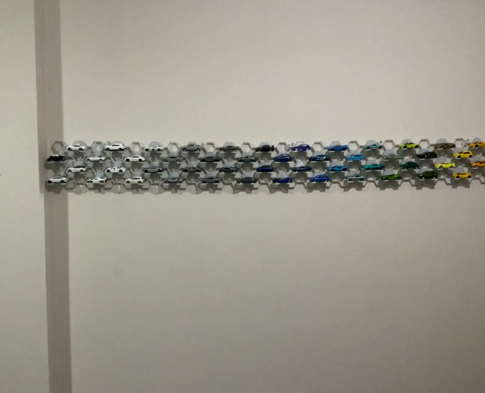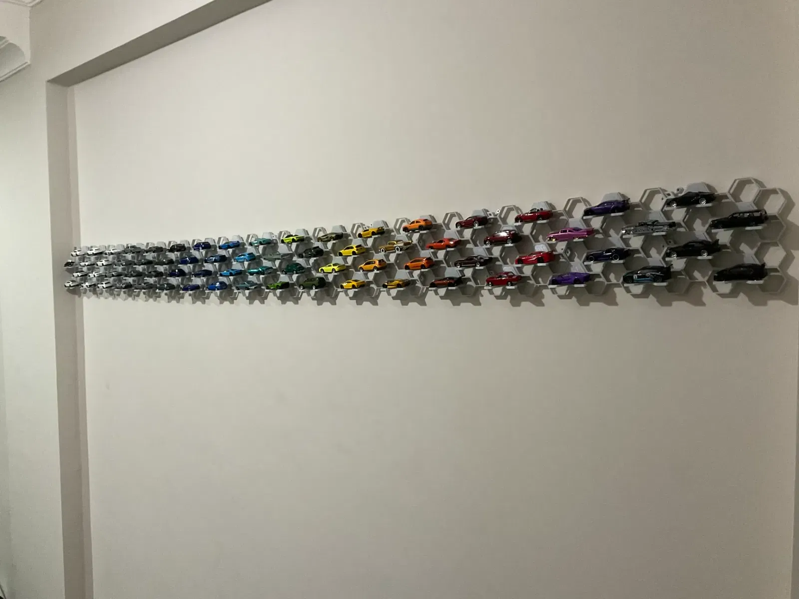 Việc lắp đặt và sắp xếp các module kệ vô cùng đơn giản. Anh em chỉ cần gắn chúng lên tường theo bất kỳ hình dạng nào mình thích, từ đường thẳng, đường cong cho đến các họa tiết phức tạp hơn. Sau đó, chỉ cần đặt những chiếc xe Hotwheels yêu quý vào các ô trống. Nhờ thiết kế ôm sát, xe sẽ được giữ chắc chắn mà không sợ rơi rớt. Đây là giải pháp hoàn hảo để lưu trữ và khoe trọn bộ sưu tập xe của mình.