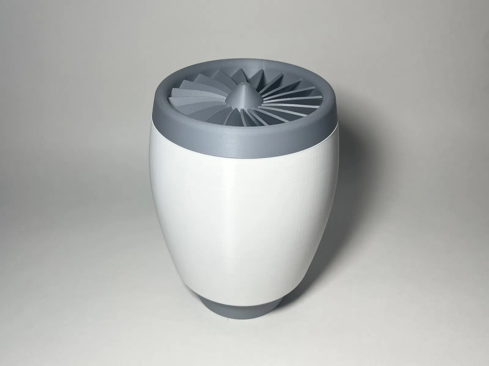 Mẫu heo đất in 3D dạng động cơ turbofan: thả xu qua các cánh quạt, nắp (fan) vặn ra vào để lấy tiền. Thiết kế gọn đẹp, vui mắt, phù hợp in PLA và trưng bày kiểu hàng không.