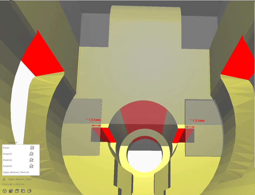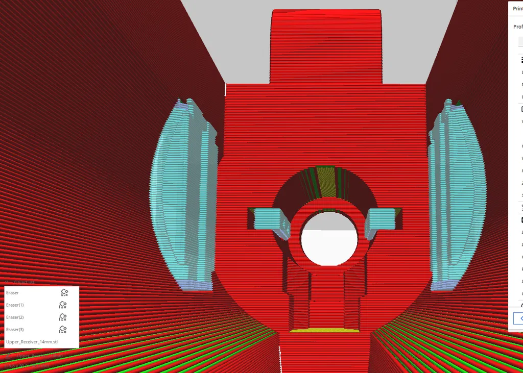 Nếu bạn dùng layer height nhỏ hơn 0,2mm thì phần ren sẽ ra đẹp hơn. Với ren, mình khuyên nên re-cut lại bằng một món kim loại tương ứng (ví dụ: Outer Barrel extension, Barrel Nut, hoặc một Upper Receiver cũ). Làm từ từ để tránh bị xéo ren.