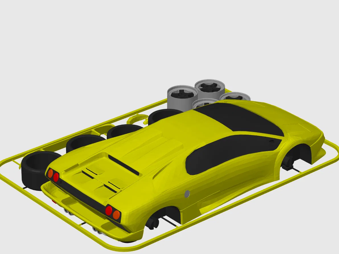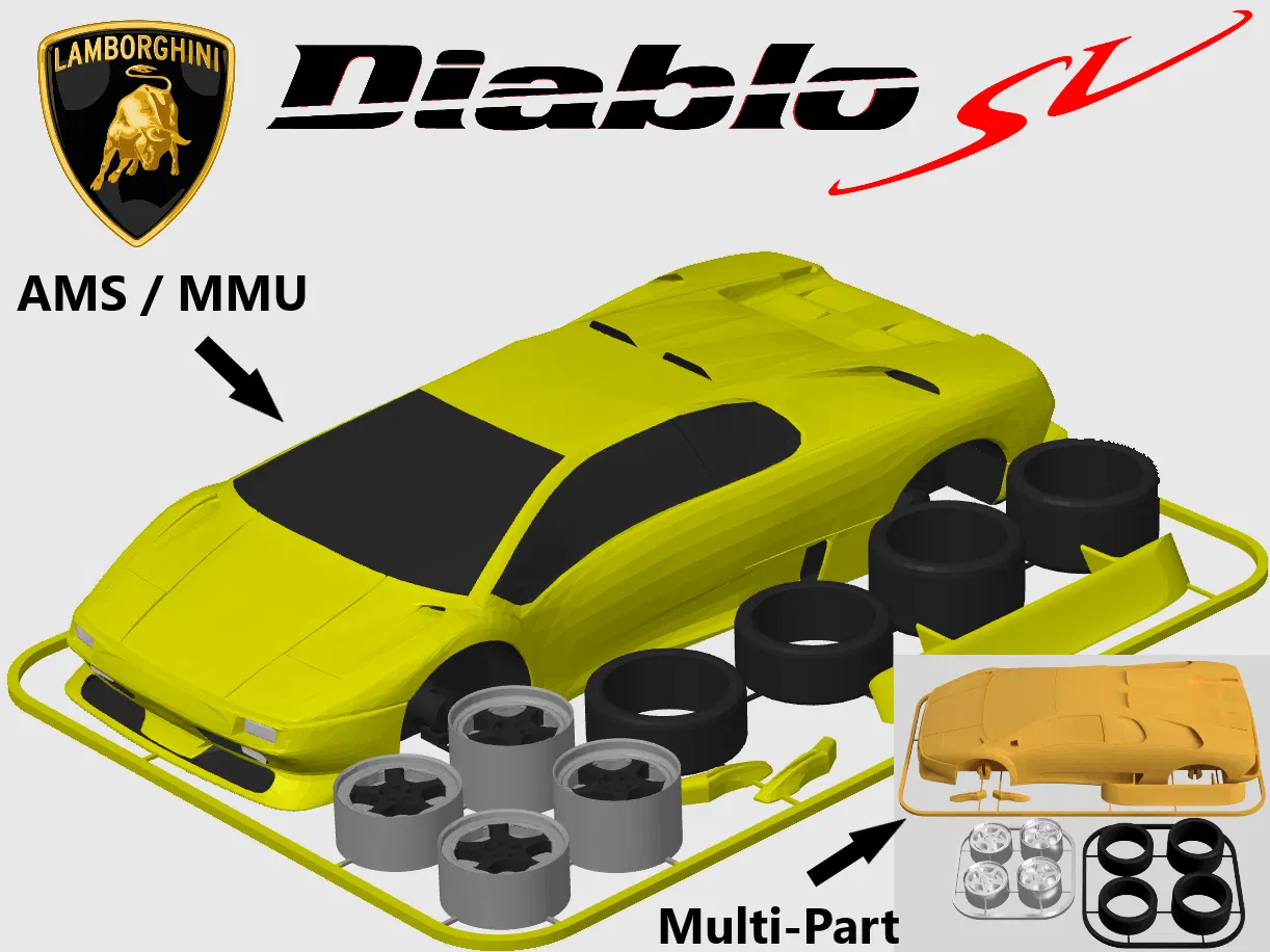 Mẫu Lamborghini Diablo SV dạng kit card tỉ lệ 1:24: in xong lắp bằng khớp nối tích hợp. Có STL in 1 màu và 3MF preset màu cho AMS/MMU. Không cần supports, khuyên layer height 0.15mm hoặc thấp hơn.