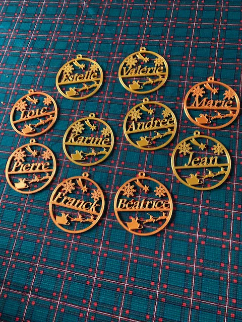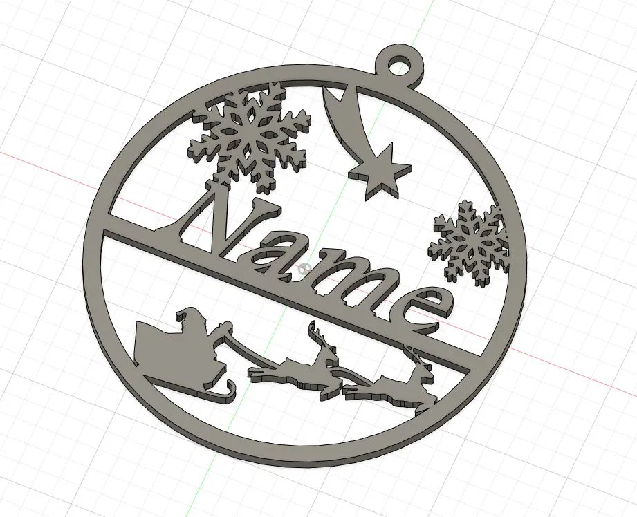 Mẫu Boule de Noël / Christmas ball dạng phẳng, đường kính Ø100mm, dày 3mm. Có thể treo cây thông hoặc đặt bàn trang trí. Tùy biến tên bằng Fusion 360 (file 3fd và 3 mf), rồi xuất ra STL để in.