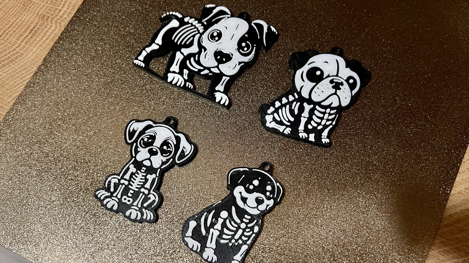 Bộ móc khóa Halloween Skeleton gồm Beagle, Pitbull, Bulldog, Boxer và Rottweiler. In 2 màu bằng cách pause ở layer 11 để đổi filament (đen sang trắng). Khuyến nghị in chậm, PETG và infill 100% để bền hơn.
