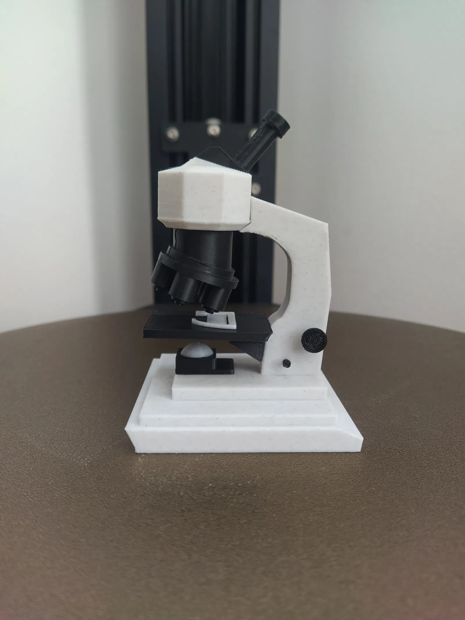 Mô hình kính hiển vi 3D-printed dạng remix, được tách thành nhiều phần để dễ phối màu và hoàn thiện đẹp hơn. Đồng thời chỉnh lại khu vực khớp nối giữa thấu kính và tay kính để lắp chắc, giữ đúng tâm.