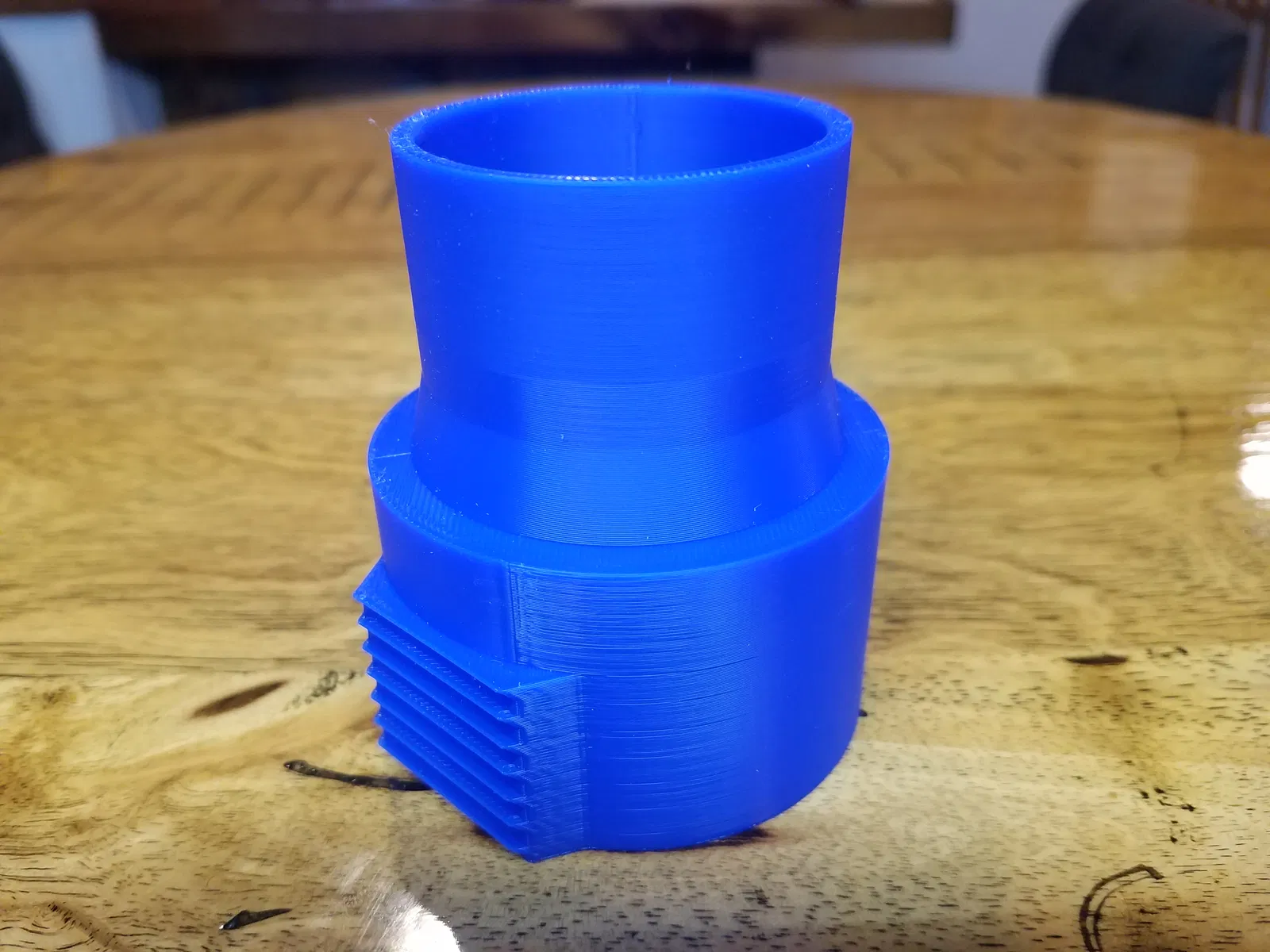 Mẫu này đã được remix để gắn vừa ống hút bụi Ridgid NXT 2.5" (đường kính ngoài OD tại đầu nối 2.25") với máy cưa DeWalt Sliding Compound Miter Saw — cụ thể là model DWS780 nhưng cũng sẽ vừa các model khác. Mình có thêm các mép vát (chamfer) ở cơ chế khóa của đầu hút và ở phần chuyển tiếp từ ống trụ lớn xuống ống trụ nhỏ để tăng độ chắc.