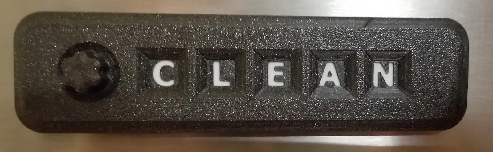 Mình thấy có vài cái kiểu này được đăng rồi, nhưng mình quyết định tự thiết kế cái của riêng mình. Chỉ cần xoay núm nửa vòng là chuyển giữa “Clean” và “Dirty”. Mình in file Letters.stl bằng 2 màu. 1mm đầu tiên được in bằng màu chữ mong muốn (trắng). Phần còn lại in bằng một màu tương phản.