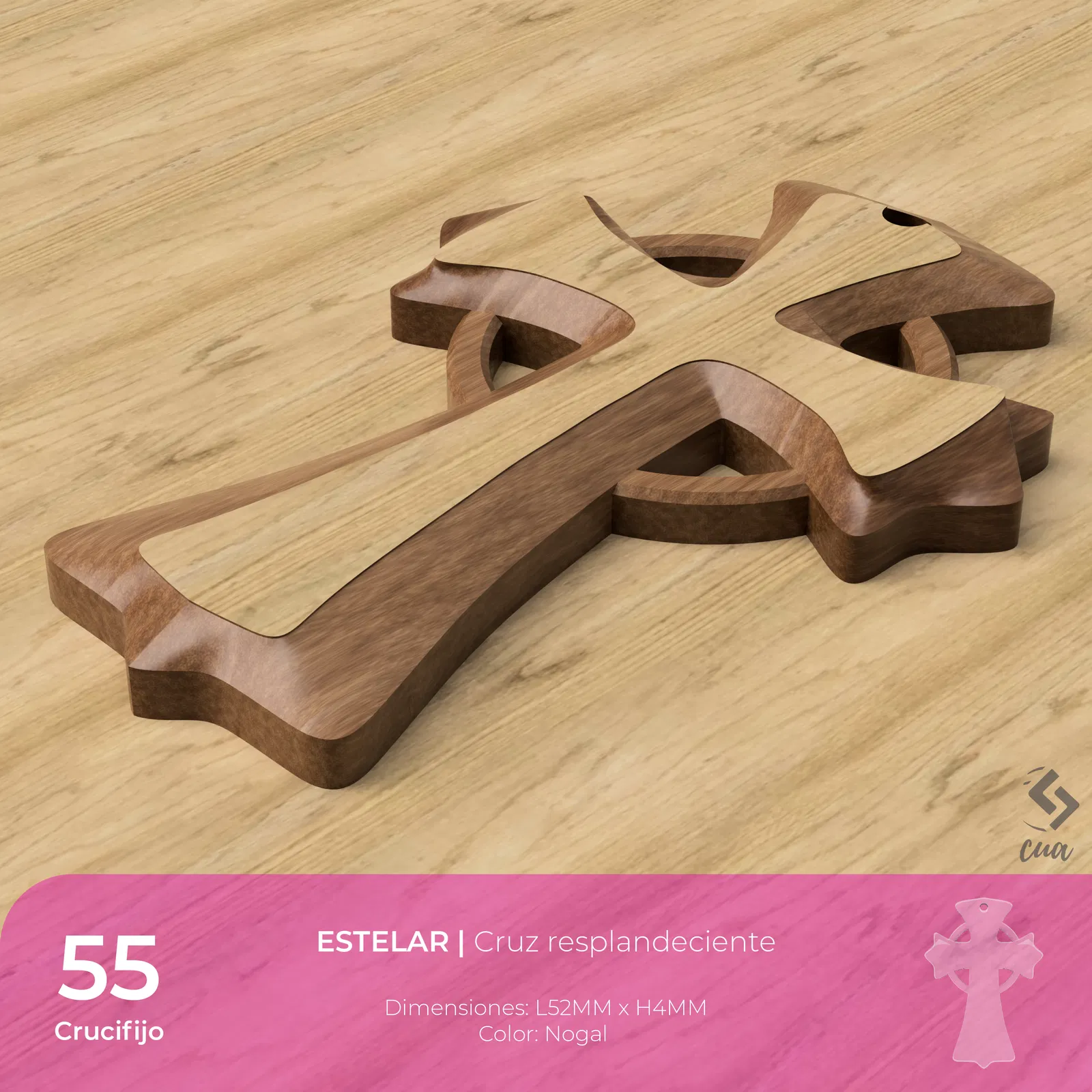 Cruz 55 là mẫu thánh giá “ESTELAR” với hiệu ứng tỏa sáng. Gợi ý vật liệu gồm filament giả gỗ Creality, giấy nhám GRANATE 150, thuốc nhuộm PARACAS AÑEJO và sơn bóng cho gỗ; kèm link trang web tham khảo.