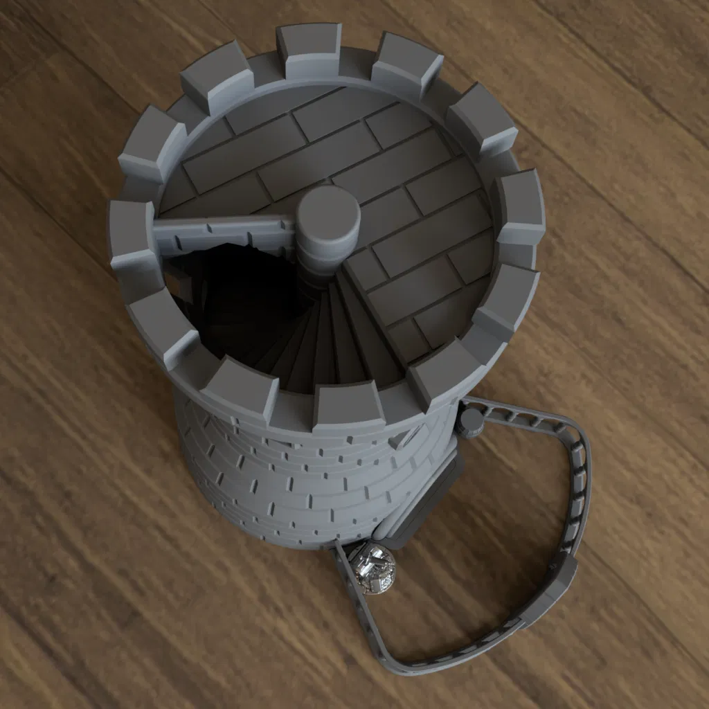 Fantasy Dice Tower đã hoàn thiện, thiết kế tối ưu để không cần support, tiết kiệm nhựa mà vẫn đẹp. Portal/cổng là phần in tùy chọn. Bản cập nhật 2021-09-10 chỉnh lại cổng, làm thanh to hơn để dễ in và chắc hơn.