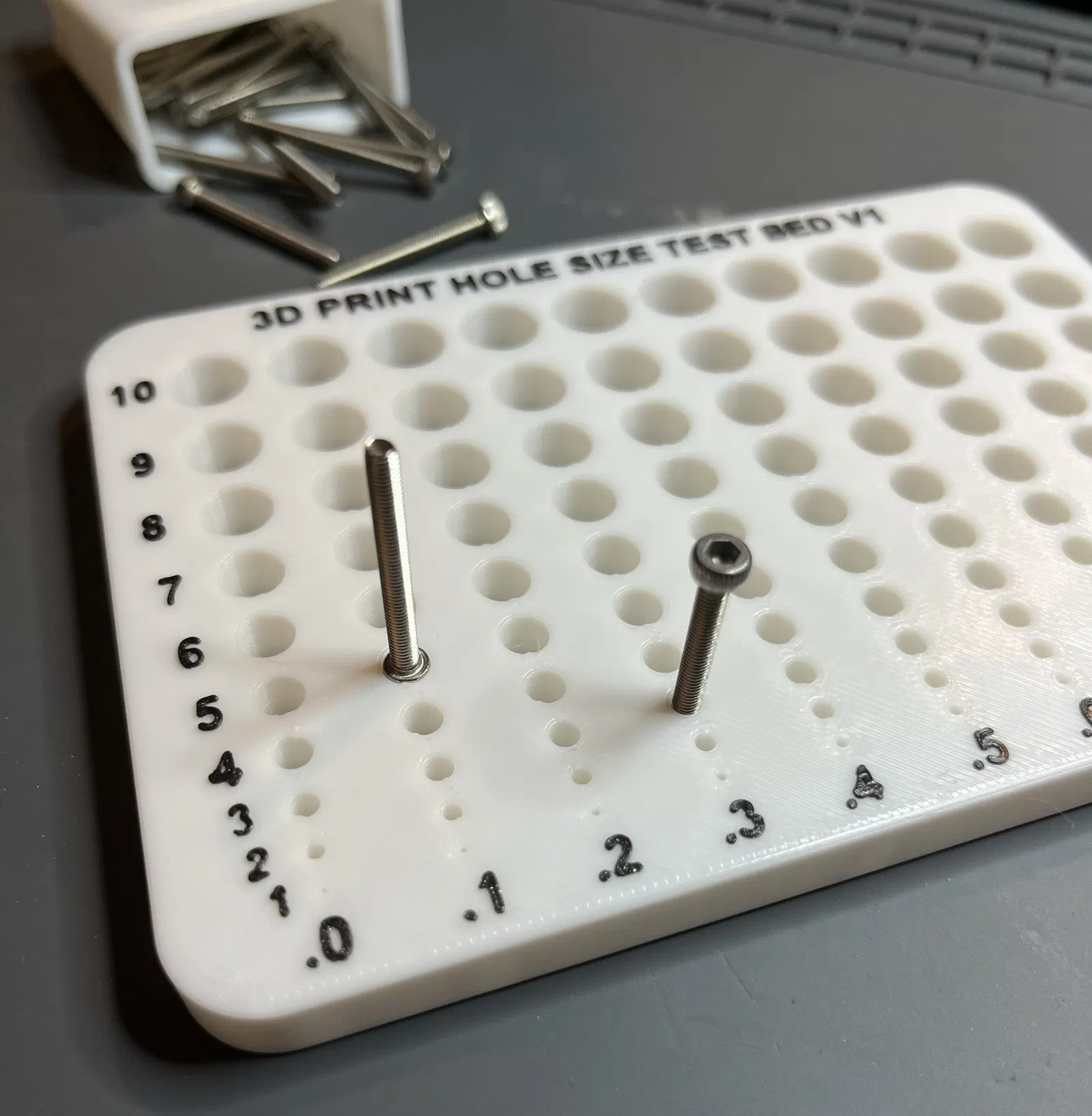 Món này cực kỳ tiện để có sẵn khi bạn thiết kế lỗ cho các chi tiết in 3D. Ví dụ lỗ phải bao nhiêu để vừa kiểu slip fit với đầu ốc M3? Cái này còn tùy máy in và cài đặt slicer của bạn. Chỉ cần đưa món cần thử vào các lỗ, tìm kiểu độ khít bạn muốn (press, slip, loose), rồi đọc đường kính lỗ tương ứng trên thang đo.