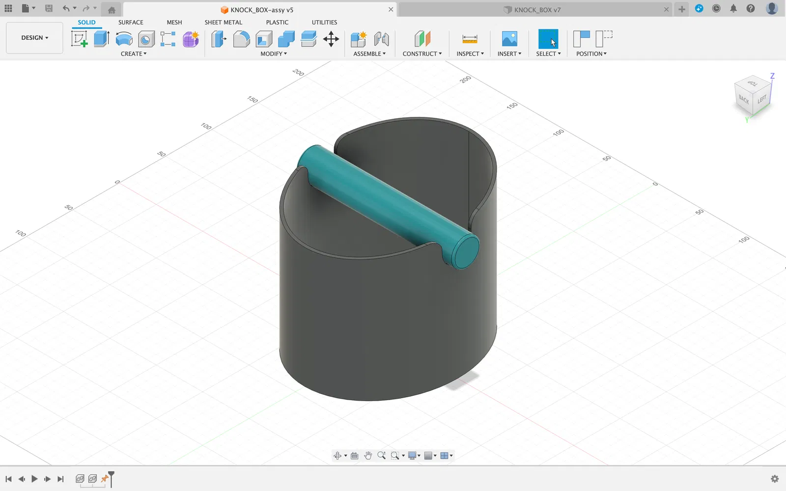 Lúc đầu mình tính lên thư viện cộng đồng kiếm mẫu coffee knock box về in, nhưng đây lại là dịp quá hợp để test workflow với Fusion 360, nên mình tự làm lại thiết kế quen thuộc này. Không có gì đặc biệt, cũng không mới mẻ gì. Cây rod được gắn vào hộp bằng các rãnh (grooves).