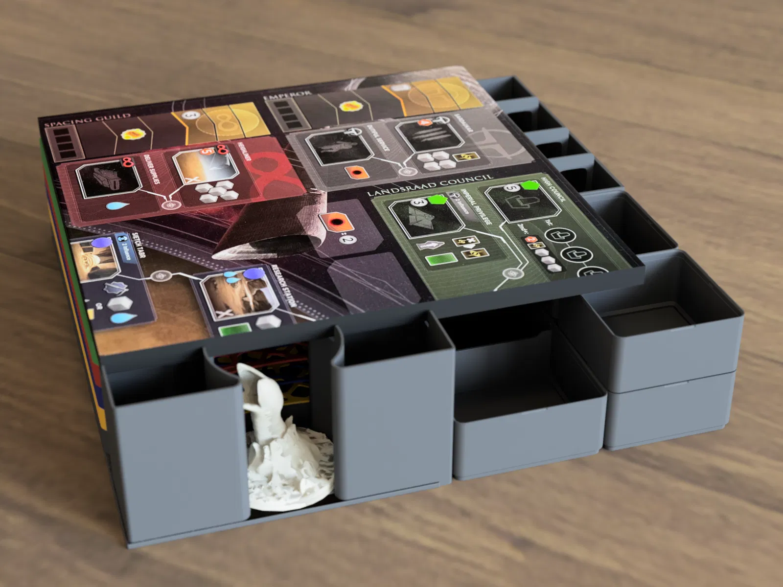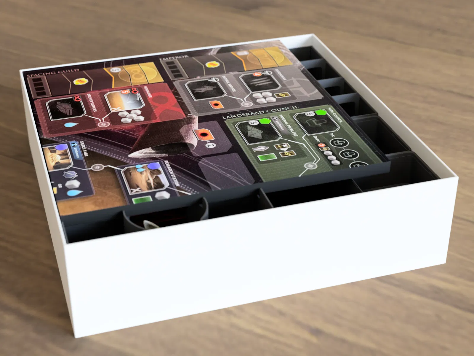 Bộ insert/organizer cho Dune Imperium Uprising (+Bloodlines), chứa vừa bài có bọc sleeve (chuẩn), có separator chia deck, khay token có nắp xếp chồng và 4 player boards tuỳ màu. Tương thích Bloodlines với vài lưu ý.