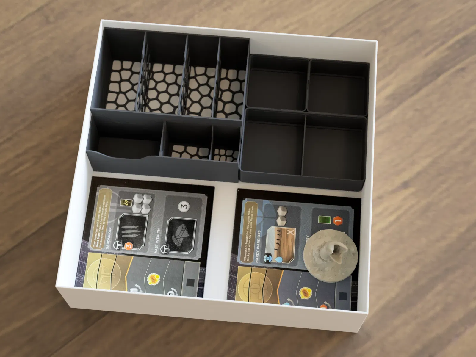 - 1 holder cho cards nhỏ (intrigue, objectives, conflict cards). Cũng vừa cards có bọc sleeve.