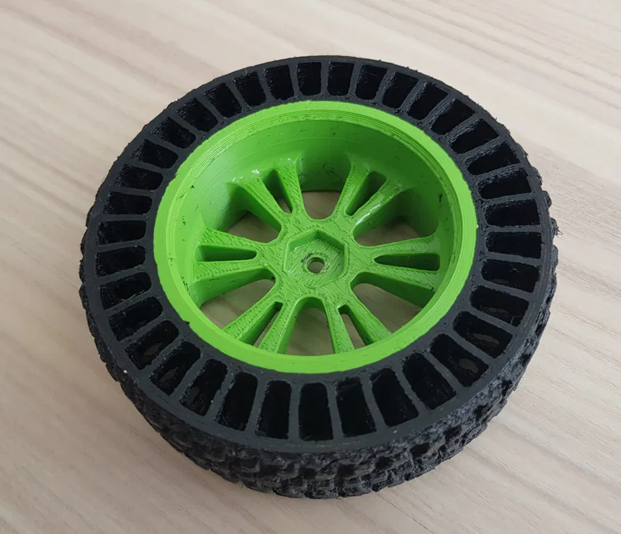 Mình thiết kế bộ vỏ này để dùng với Traxxas E-Revo VXL 1/16 của mình. Đây là bản in dual extrusion. Mình dùng PLA (xanh lá) và Flex (đen). Mấy vỏ này bị drift nhiều hơn mấy loại vỏ khác mình mua cho xe RC. Mình thử nhiều loại vỏ với các vật liệu mềm khác nhau mà không loại nào bám sàn tốt (filament Flex là ổn nhất).