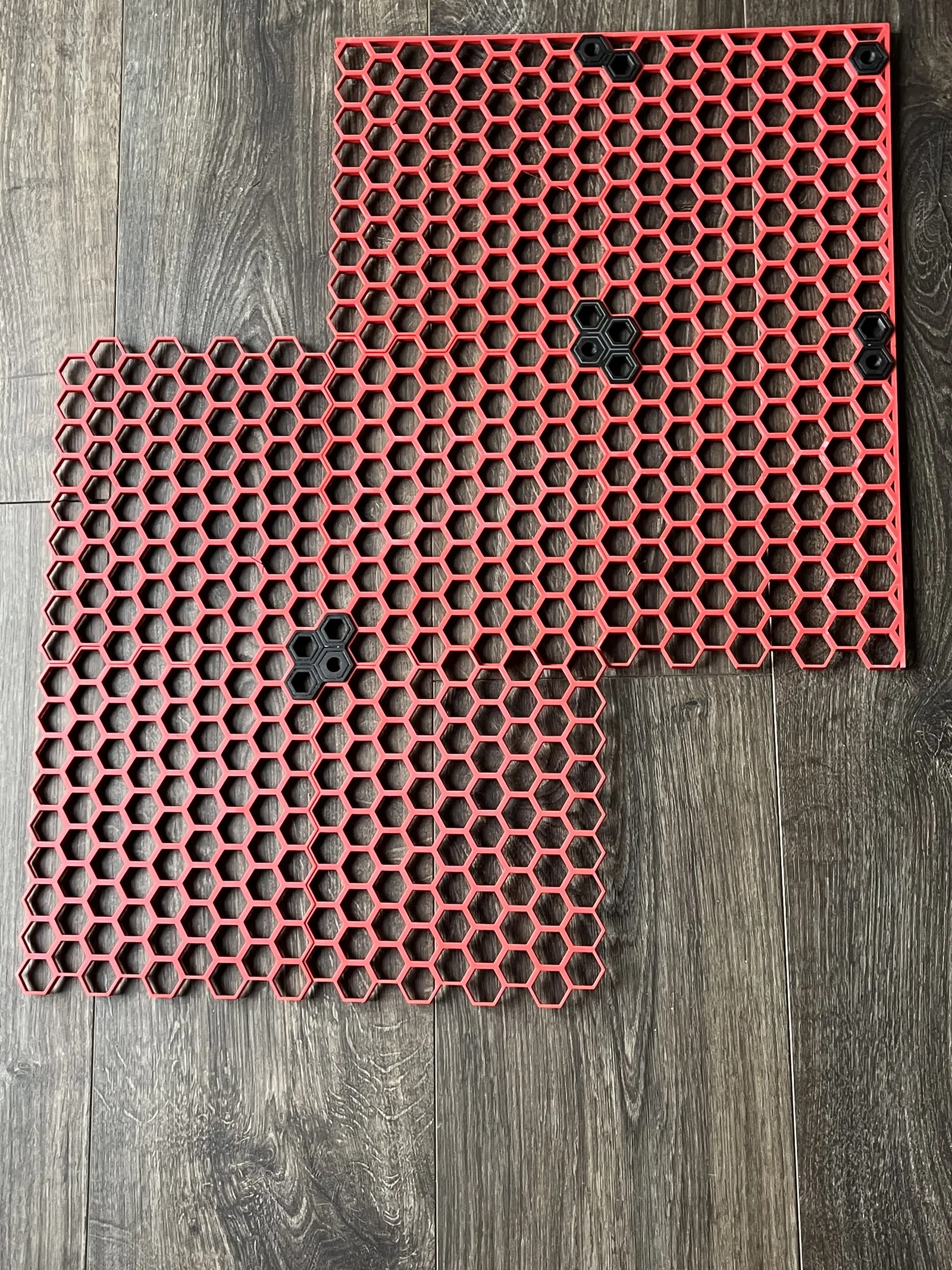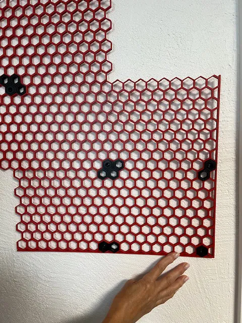 Phiên bản 3x3 của panel Honeycomb storage wall 224x190 có thêm viền/edge theo hệ của RostaP. Các góc ký hiệu A–D, tấm bên theo cặp chữ, tấm giữa giữ nguyên; nếu hơn 3 hàng thì xen kẽ AC/BD.