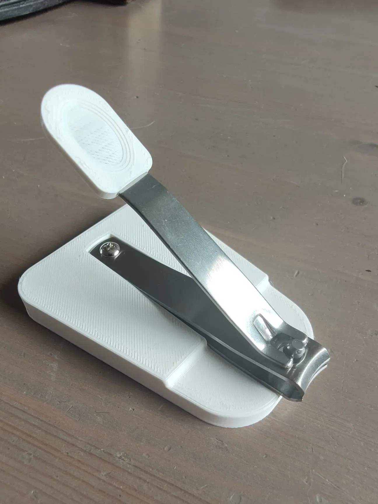 Mô hình này tạo ra một cơ sở hỗ trợ cho một chiếc kẹp móng tay để nó có thể được vận hành bằng một tay.