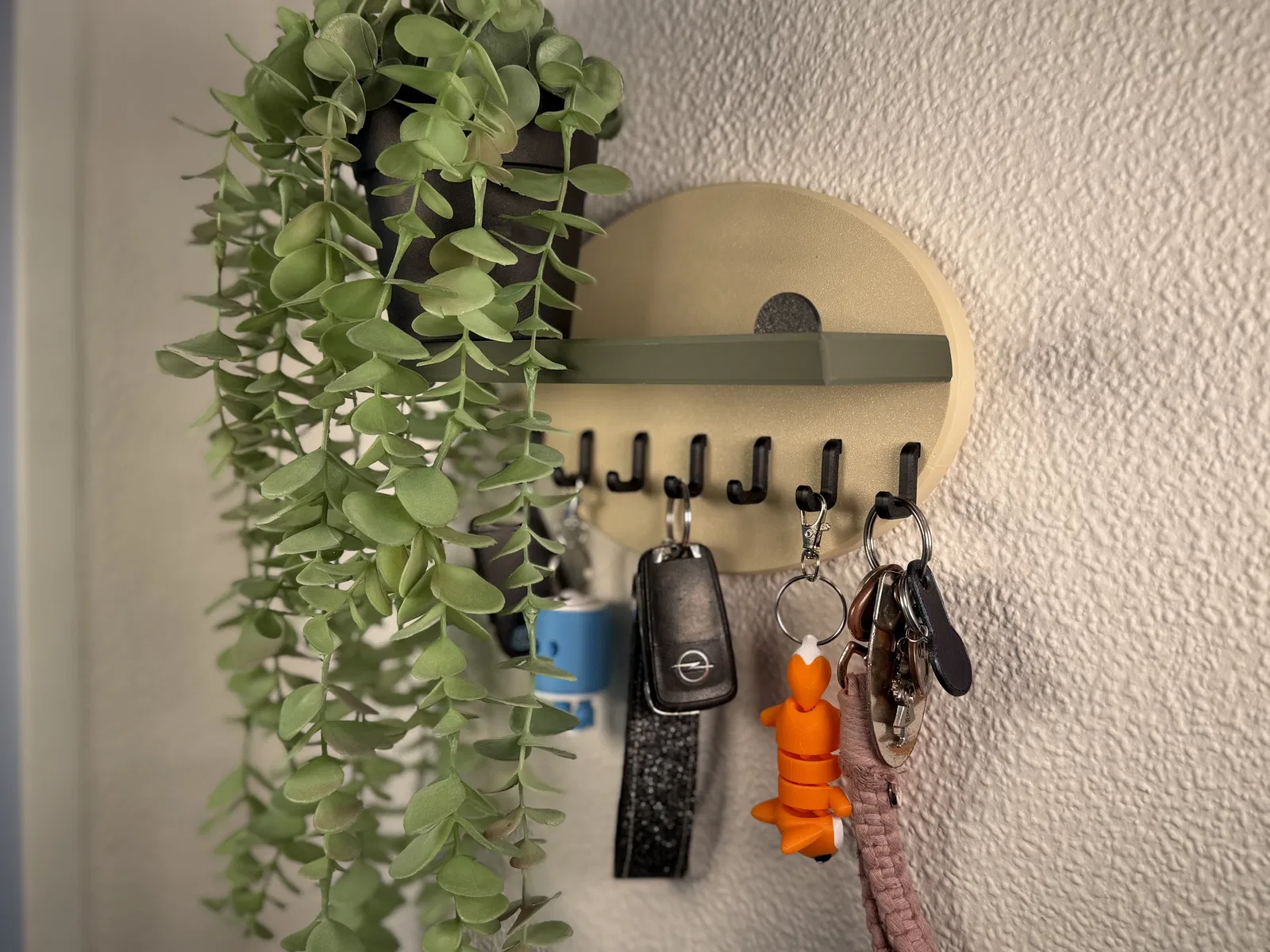 Mẫu kệ treo chìa khóa gắn tường có thêm kệ để đồ, giúp sắp xếp gọn gàng chìa khóa và vật dụng hằng ngày. Tất cả chi tiết đã test, in được không cần supports; móc có thể dán keo nếu hơi lỏng.
