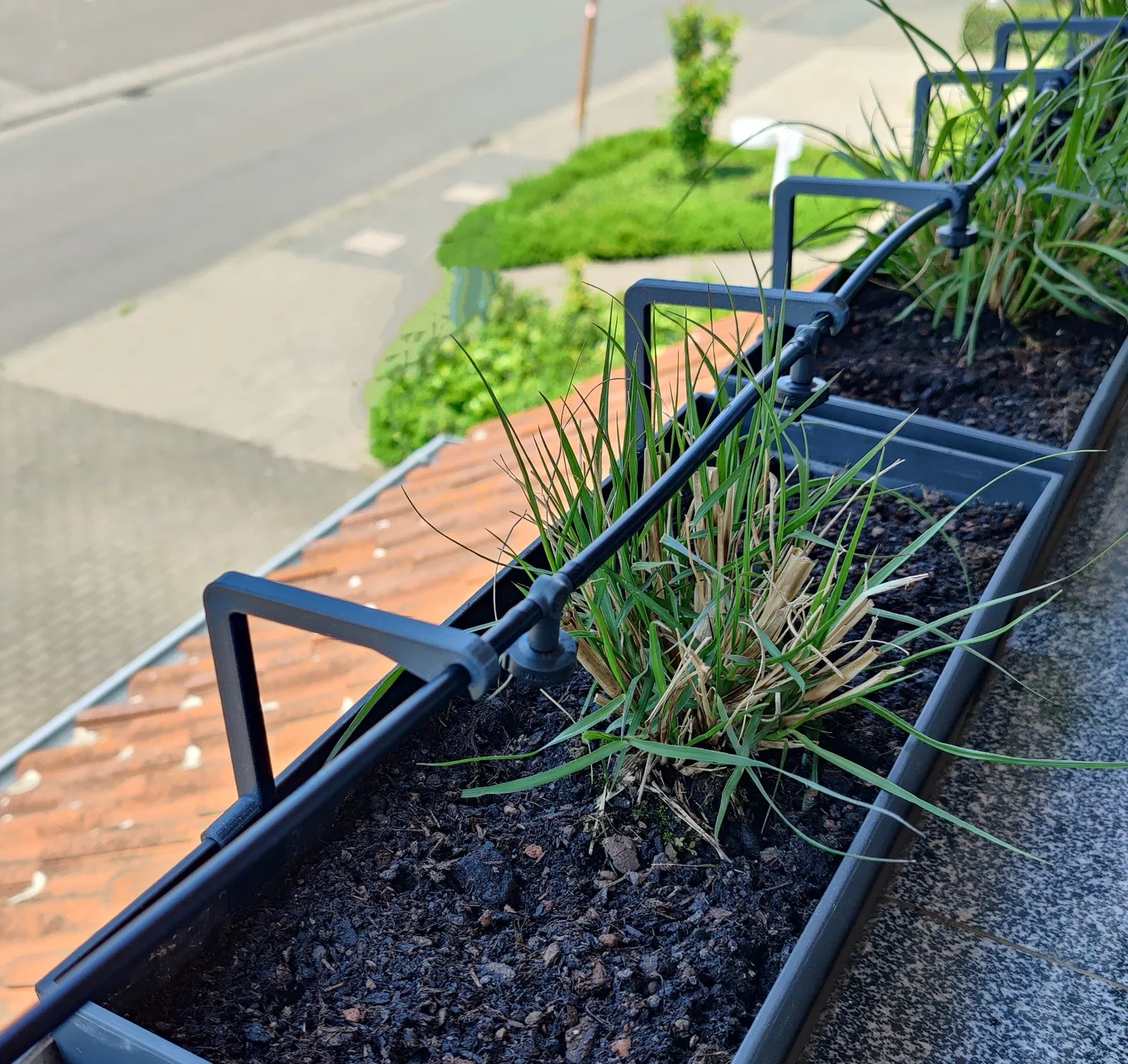 Với cái ngàm (bracket) này, mình gắn hệ thống tưới Gardena Micro-Drip lên các chậu/hộp trồng hoa (flower box) của mình. Độ dày thành hộp là 4 mm và phần vươn ra của ngàm là 70 mm.
