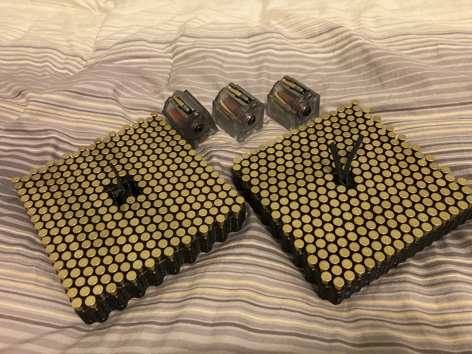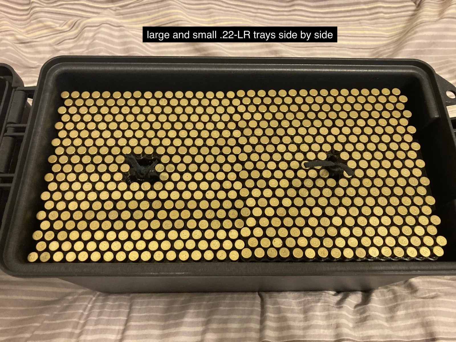 Mấy cái khay này được thiết kế để vừa trong hộp theo dạng 2 chồng (2 stacks), không có phần nào nhô ra để dù khay trống vẫn chồng lên nhau được. Mình làm mấy cái vòng để nắm ở giữa cho dễ nhấc ra, nhưng mình rất khuyên bạn cột thêm sợi dây vô mấy cái vòng đó giống như mình làm trong hình. Khay 9mm và 5.56 có cùng kích thước đáy (footprint), nên bạn có thể để phối hợp hai cỡ đạn đó trong cùng một hộp. Phần tối ưu số viên .22-LR trong một khay khá “căng” — hộp Plano bị thu nhỏ dần về phía đáy, nên hai khay loại 16 hàng đạn .22-LR thì còn dư chút không gian, nhưng hai khay 17 hàng thì lại to quá không nhét vừa. Vì vậy với .22-LR, bạn có thể in toàn bộ khay nhỏ, hoặc mỗi tầng dùng một cặp gồm 1 khay lớn + 1 khay nhỏ.