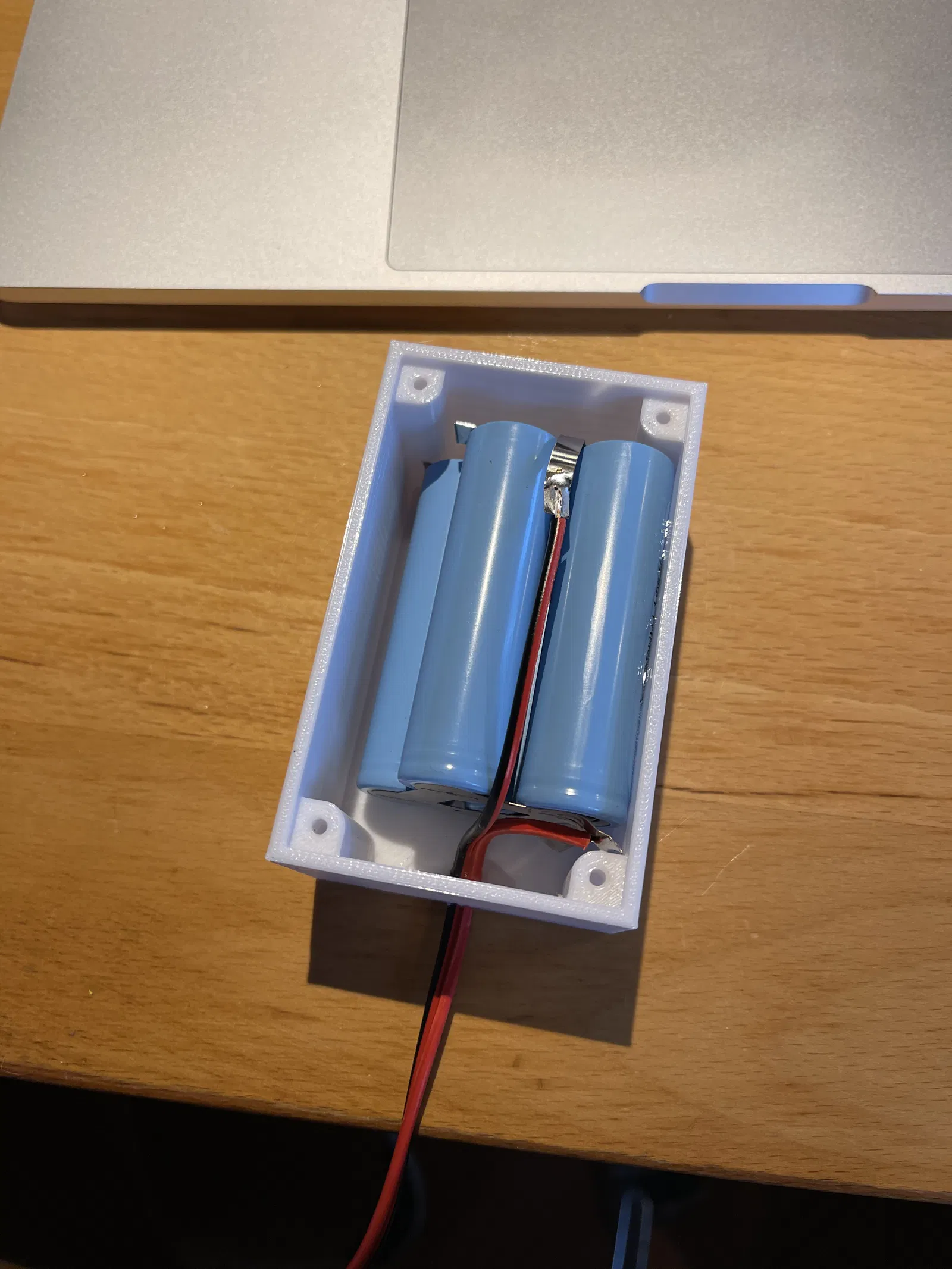Bộ sạc đang dùng (xem phần 1) có sẵn ngàm gắn pin 14500. Nếu bạn không tin dung lượng của nó (3.7V, khoảng 1000mAh) và muốn tăng thêm dung lượng, thì hộp battery pack này là dành cho bạn. Để dùng bốn cell 18650 tôi có từ xe đạp điện, tôi đã làm thêm cái hộp tuỳ chọn này. Bốn cell được nối song song và cho ra (3.7V, 4x3.200W). Mức này rõ ràng là quá lớn so với tấm pin mặt trời (5W) đang dùng, nhưng tôi còn dư cell nên tận dụng. Hộp này không thiết kế để vừa khít một kích thước cụ thể; tôi chỉ dán nguyên cụm 4 cell xuống đáy hộp.