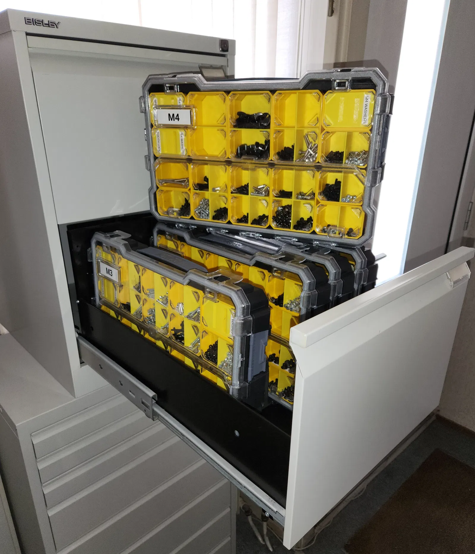 Nắp cho Stanley FatMax FMST1-75779 Shallow Organizer giúp giữ washer/long đền nhỏ không bị trôi qua ngăn khác. In PLA, layer 0.2mm, nozzle 0.4mm; đặt mặt trên nắp xuống printbed, không cần support. Có file f3d.