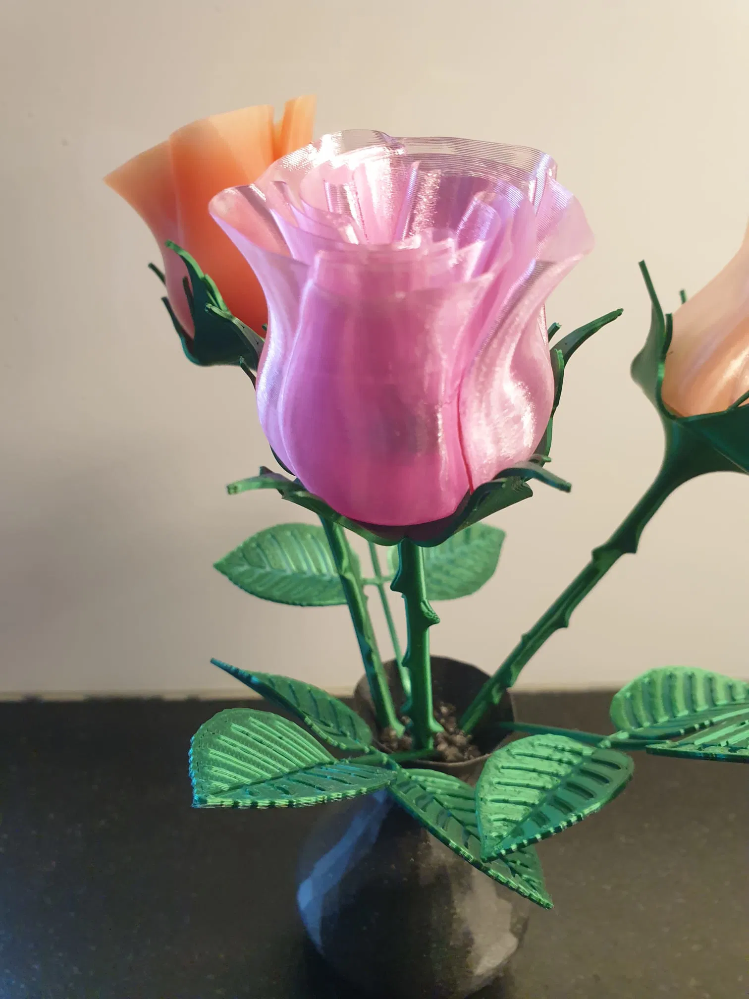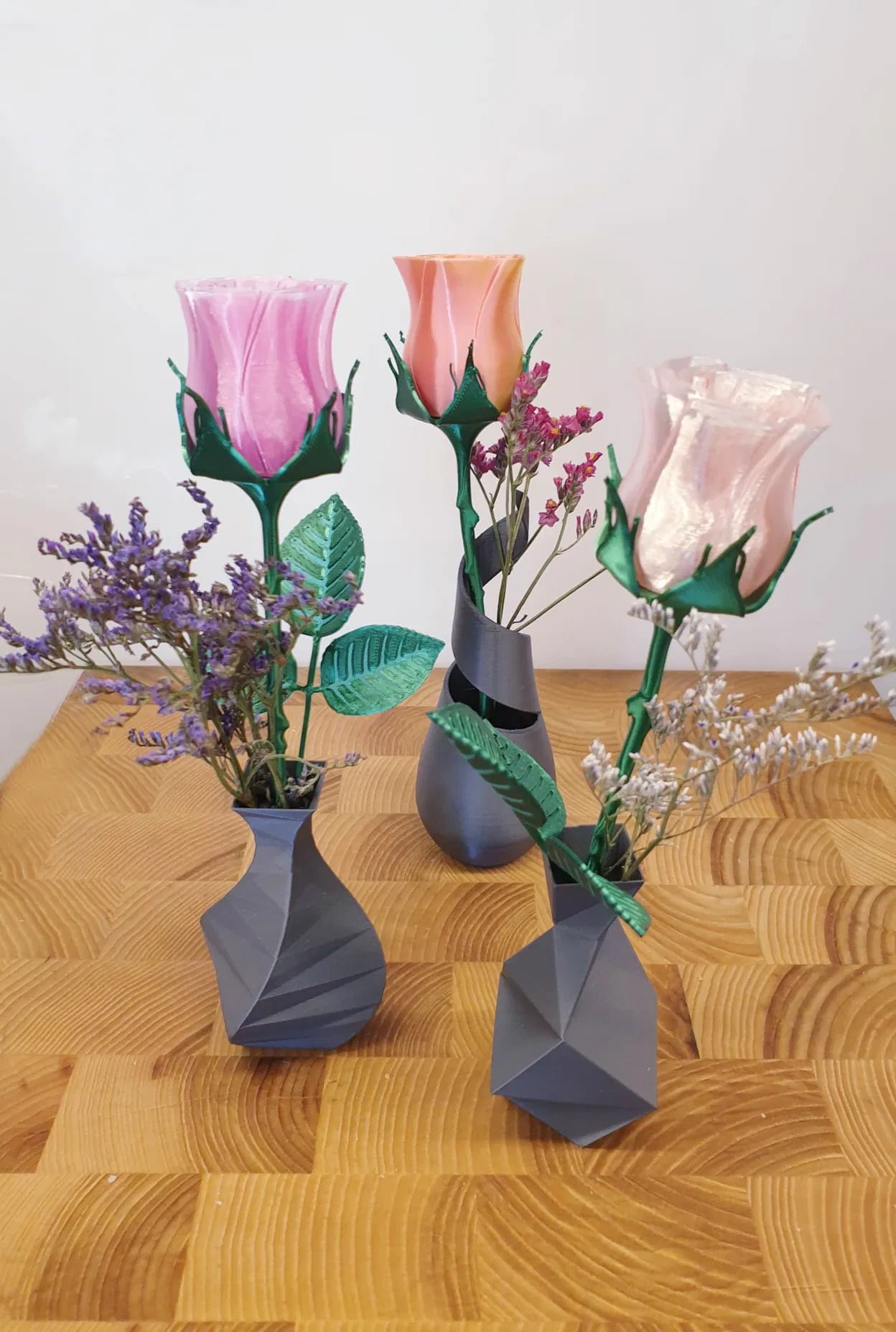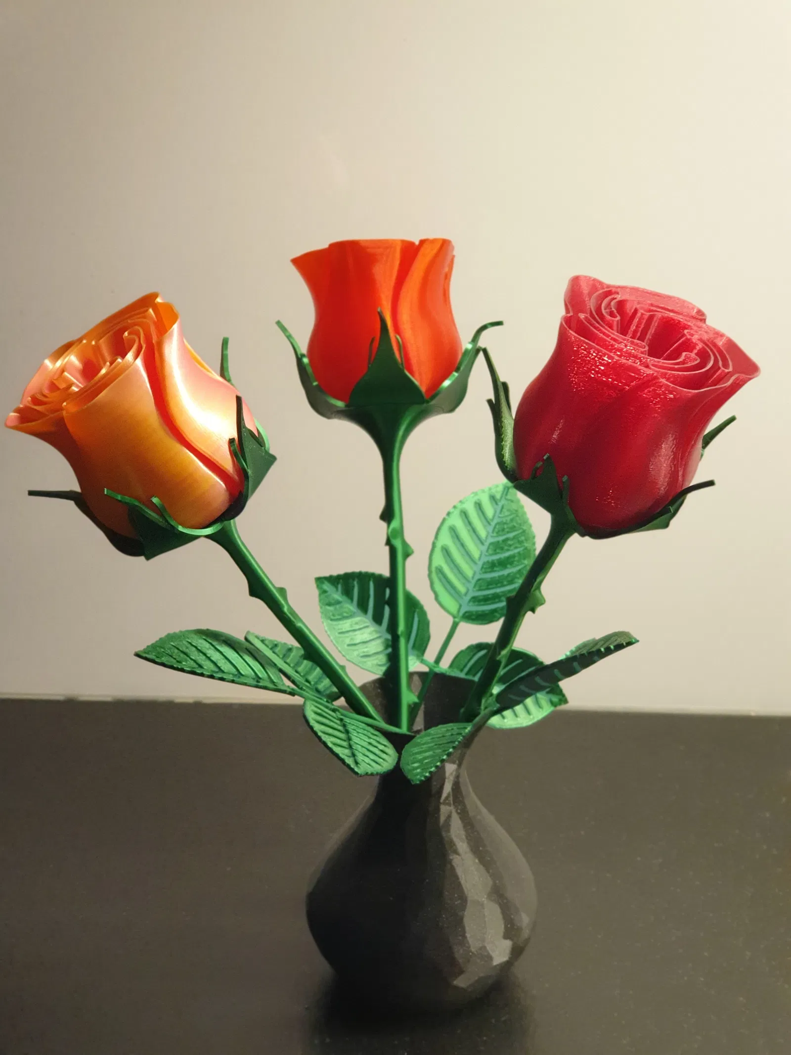 Một mẫu thiết kế độc lập, bổ trợ rất đẹp cho thiết kế cành hồng có gai, nhưng cũng có thể hợp với các loại hoa khác. Lá được in rất đơn giản, để phẳng trên print bed, bạn có thể làm thêm đổi màu. Điểm “twist” nằm ở chỗ: với sự hỗ trợ của súng hơi nóng (máy sấy tóc thường hoặc heat gun), bạn có thể uốn lá cực dễ để ra dáng tự nhiên, nhìn mềm mại hơn. Những chiếc lá đậm màu trong ảnh được in phần dưới bằng transparent PLA và phần trên bằng silky PLA. Chiếc lá sáng màu được in bằng transparent PETG.