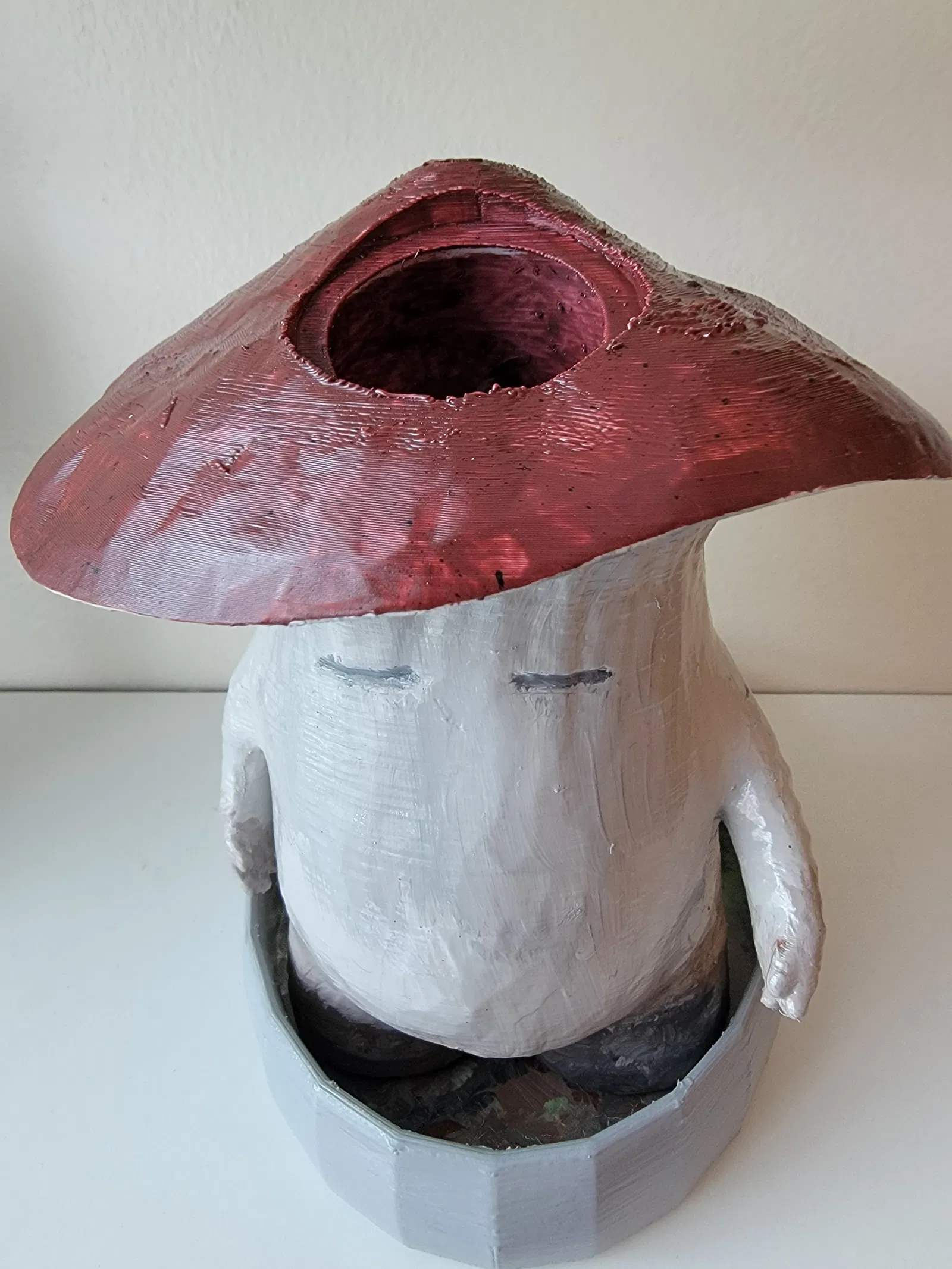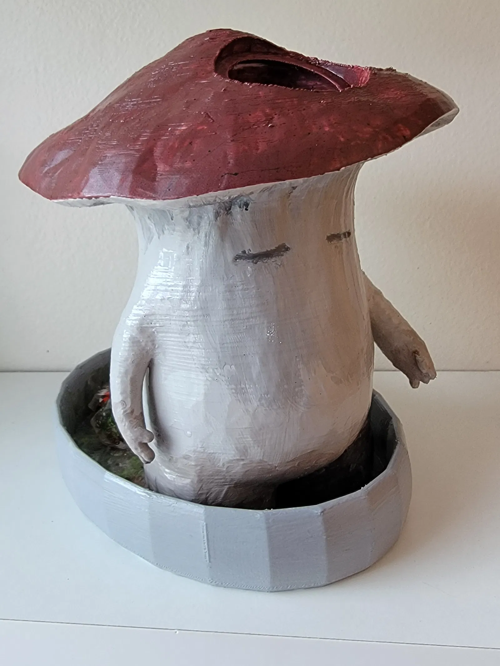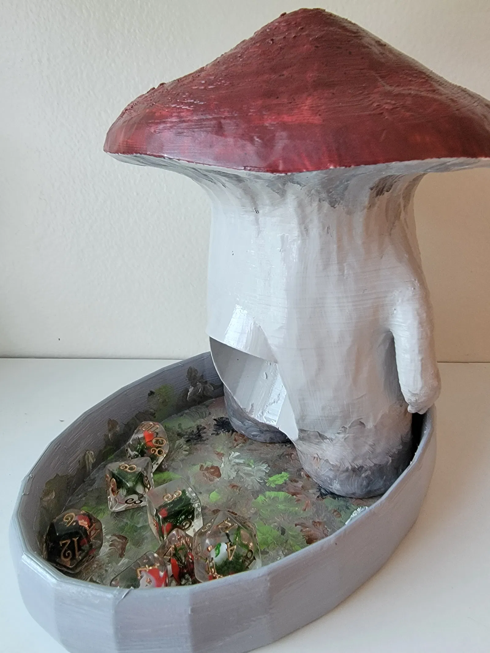Bản chỉnh sửa từ Dark Souls Mushroom Child: làm kênh rơi xúc xắc mượt hơn, thêm tumblers và có base để hạn chế lăn rớt bàn. Miệng thả lớn, fit chắc nhờ peg; có thể dán hoặc để rời.