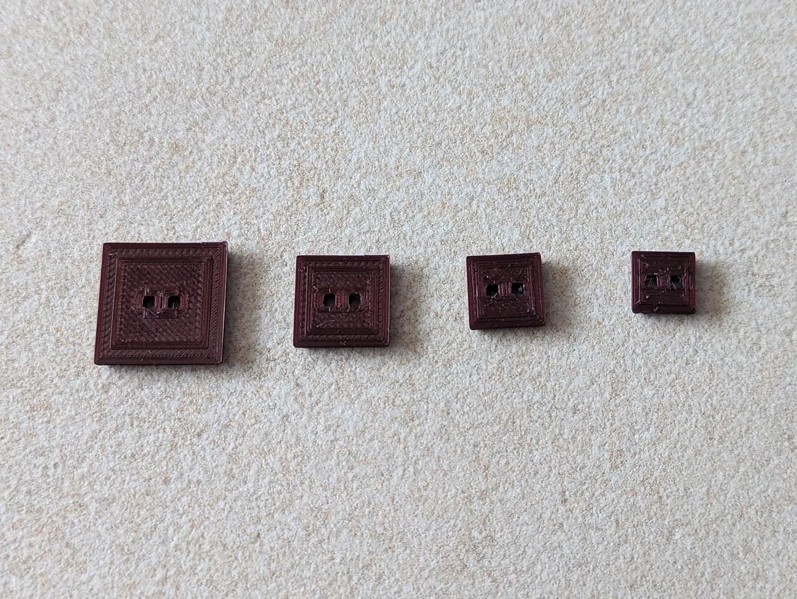 Các nút hình vuông đơn giản (quần áo) với phép đo 10 x 10, 12 x 12, 15 x 15 và 20 x 20 mm.