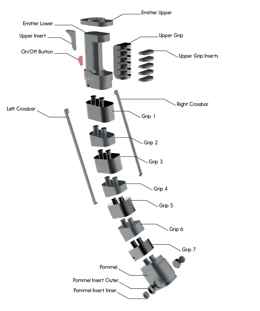 Nhớ in 5 cái Upper Grip Inserts và 2 bộ Pommel Inserts (Outer và Inner). Tất cả file STL mình để đúng theo hướng mình đã in; cá nhân mình in Lower Emitter, Upper Grip và Upper Emitter với supports tạo trong Cura, nhưng như thường lệ nếu bạn có cách nào hay hơn thì báo mình biết nha. Các phần grip đều có ghi số tương ứng ở phía trên vì nhìn na ná nhau nên rất dễ bị lộn. Dung sai (tolerances) của các phần này khá khít, nên có thể phát sinh vấn đề tolerance stack up với các crossbars; tuy nhiên các crossbars đã được scale có tính tới chuyện đó rồi. Nếu có lỗi hay vấn đề gì thì cho mình biết với. Chúc in vui!