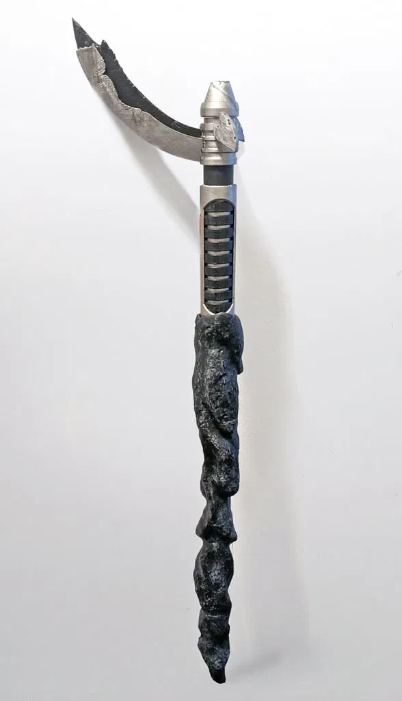 Mình có “nêm” thêm chút sáng tạo để đưa cây saber này từ phong cách hoạt hình ra đời thật hơn, có thêm vết hư hỏng/dập xước, nhất là quanh phần vòng (ring) đã được chỉnh lại để làm tay cầm cho cây gậy. Mình không thể khuyến nghị dùng nó như một cây gậy chống đúng nghĩa; nếu bạn định tì/đè nhiều lực lên thì nhớ gia cố thêm.