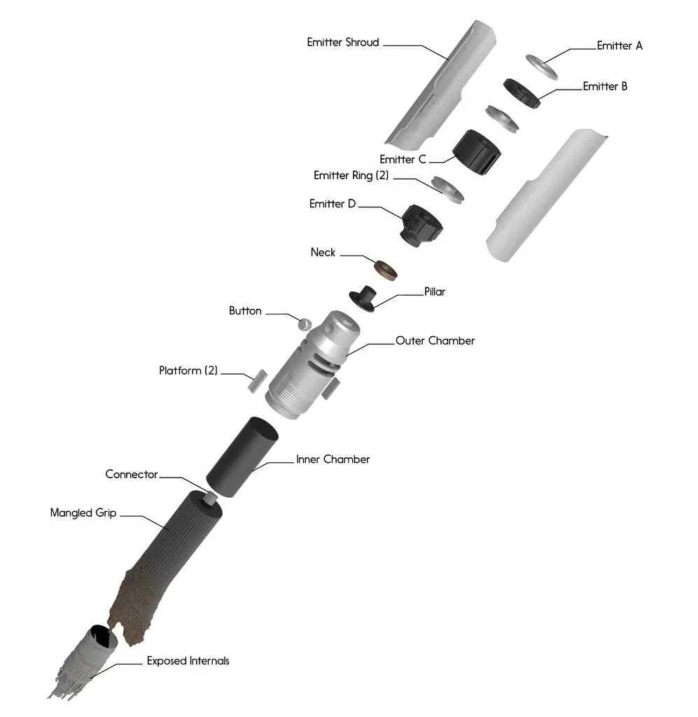 Mẫu Cal Kestis' Lightsaber từ Jedi: Fallen Order, kịp Star Wars Day 2020. Hướng dẫn in các phần Emitter Shrouds/Emitter C/Outer Chamber với supports trong Cura, lưu ý phần nối Exposed Internals và Mangled Grip.