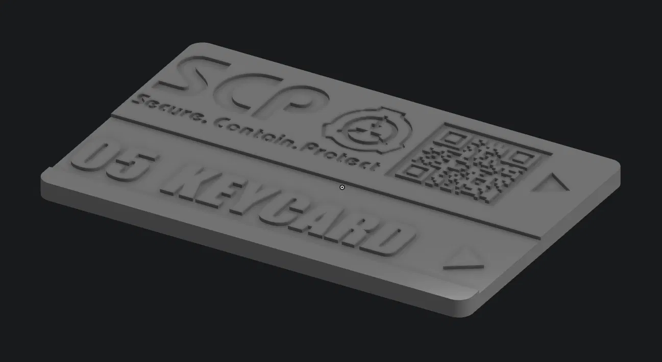 Mẫu thẻ SCP:SL 05 Keycard (bản gốc bởi Spiderdemon667). In PLA đen/trắng, không cần supports, infill 100%. Nhớ đặt color change ở layer 9 (hoặc layer bắt đầu hiện graphics) để ra đúng chi tiết.